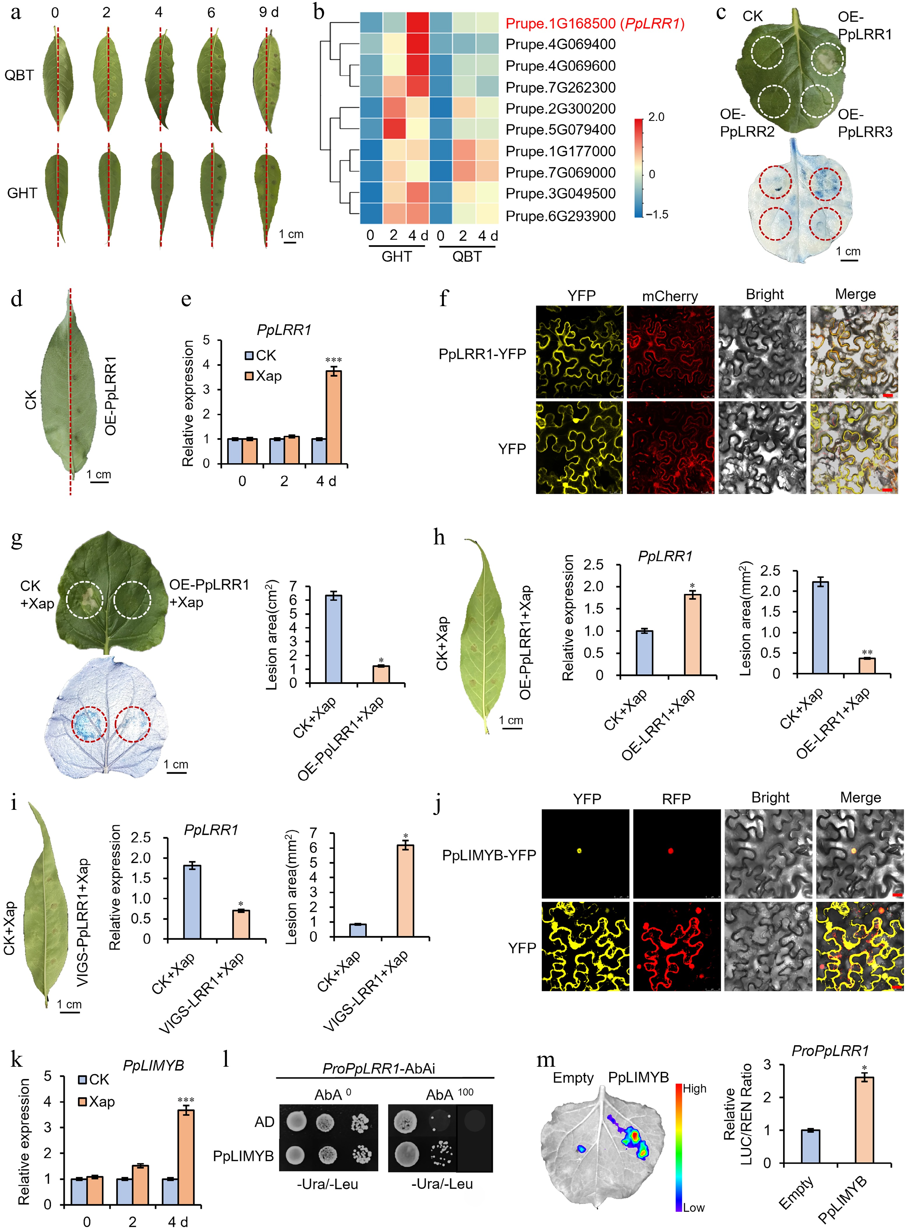 Functional validation of PpLRR1 in resistance to peach bacterial spot disease. (a) Phenotypic comparison of peach leaves from 'Qiubaitao (QBT, Prunus persica)' and 'Guanghetao (GHT, Prunus mira)' cultivars inoculated with Xanthomonas arboricola pv. pruni (Xap) vs control at 4 dpi. Transcriptome sequencing was conducted on leaf samples at 0, 2, and 4 dpi. Scale bar = 1 cm. (b) Heatmap of differentially expressed genes (|log2FC| > 1, p < 0.05) identified from RNA-seq data. PpLRR1 is highlighted in red. (c) Trypan blue-stained tobacco leaves transiently overexpressing PpLRR1, PpLRR2, or PpLRR3 compared to the empty vector control at 3 dpi. (d) Hypersensitive response phenotype in peach leaves transiently overexpressing PpLRR1 at 4 dpi. (e) Relative expression of PpLRR1 in 'Mantianhong (MTH)' peach leaves at 0, 2, and 4 dpi, measured by qRT-PCR. Expression was normalized to the sterile water-injected control, set to 1. (f) Subcellular localization of PpLRR1-YFP fusion protein in Nicotiana benthamiana epidermal cells. Yellow fluorescence (YFP) co-localizes with the red fluorescent plasma membrane marker (mCherry). OD600 = 1.0. Cultivate for 48 h after injection. Scale bar = 25 μm. (g) Quantification of lesion area in tobacco leaves co-inoculated with Xap and overexpressing PpLRR1 at 3 dpi (trypan blue staining). (h) Lesion area and relative PpLRR1 expression in MTH peach leaves co-inoculated with Xap and overexpressing PpLRR1 at 4 dpi. (i) Lesion area and PpLRR1 expression in MTH peach leaves co-inoculated with Xap following PpLRR1 silencing. TRV, TRV1 + TRV2; PpLRR1-TRV, TRV1 + PpLRR1-TRV2. (j) Subcellular localization of PpLIMYB-YFP fusion protein in transgenic N. benthamiana epidermal cells. Yellow fluorescent signal (YFP) co-localizes with RFP (red). TM–NR: tonoplast marker and red fluorescent nuclear marker (Nucleus–RFP). OD600 = 1.0. Cultivate for 48 h after injection. Scale bar = 25 μm. (k) Relative expression levels of PpLIMYB in peach leaves at 0, 2, and 4 dpi assessed by qRT-PCR. Expression was normalized to the sterile water-injected control, set to 1. (l) Yeast one-hybrid assay showing direct binding of PpLIMYB to the PpLRR1 promoter. AbA0: medium without AbA; AbA100: medium with 100 ng/mL AbA. (m) Dual-luciferase reporter assay quantifying PpLIMYB-mediated activation of the PpLRR1 promoter. Data represent mean ± SD of three biological replicates (*p < 0.05). Each treatment was performed in triplicate, and each replicate contained three to five peach leaves. Error bars indicate standard deviation. Statistical significance was assessed by one-way ANOVA and t-test: * p < 0.05; ** p < 0.01; *** p < 0.001.