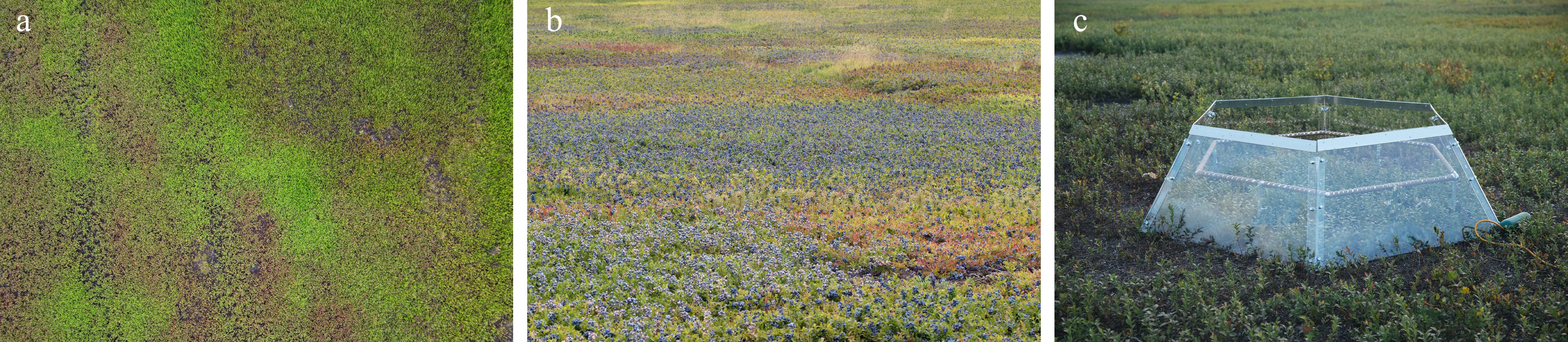 Images of the wild blueberry fields and the open-top warming chamber used in this study. (a) UAV image showing the mixture of different clones in a wild blueberry field; (b) a close-up image showing different colors of different clones; (c) an image showing the open-top warming chamber with the active heating system used in the present study. Photo credit: Xiaoxue Mo.