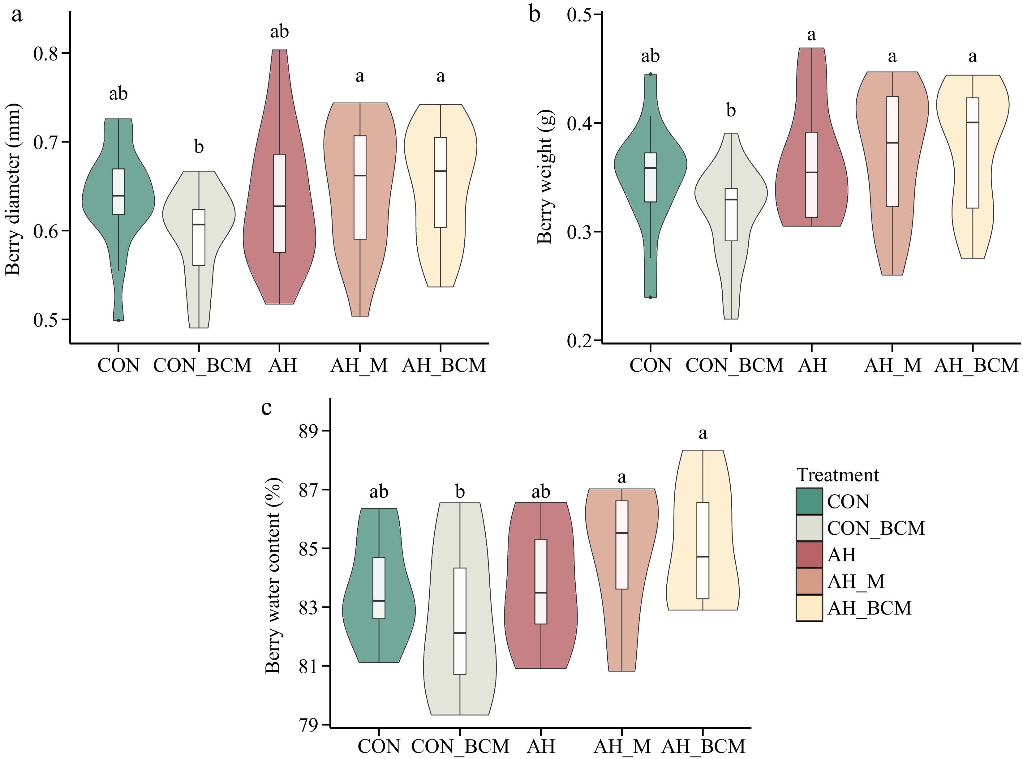 Physical properties of wild blueberries. (a) Berry diameter (mm), (b) berry weight (g), and (c) berry water content (%), under different climate warming and mitigation treatments. The treatments include warming without amendment (AH), warming with mulching (AH_M), and warming with biochar-compost mix (AH_BCM), compared with control plots without (CON) and with biochar-compost mix (CON_BCM). The bar within each violin plot represents the average value across 20 berries. Letters above the boxes indicate significant differences based on Tukey's HSD post hoc test following two-way ANOVA (p < 0.05).