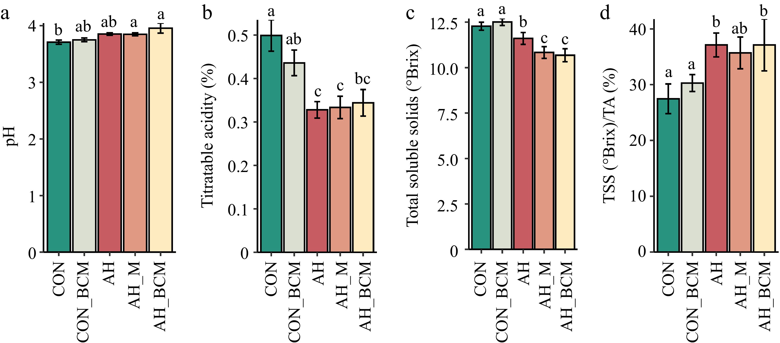 Total soluble solids (TSS) in the CON_BCM plots (12.5 °Brix) did not differ significantly from those in CON (12.3 °Brix) (p > 0.05; Fig. 3c). However, TSS levels were significantly lower in all warming treatments compared with CON and CON_BCM. Additionally, berries from the AH_M and AH_BCM treatments had significantly lower TSS (p < 0.05) than those from AH (Fig. 3c). The ripening index (TSS/TA) in warming treatments (AH and AH_BCM) was significantly higher (p < 0.05) than in the ambient controls (CON and CON_BCM) (Fig. 3d).