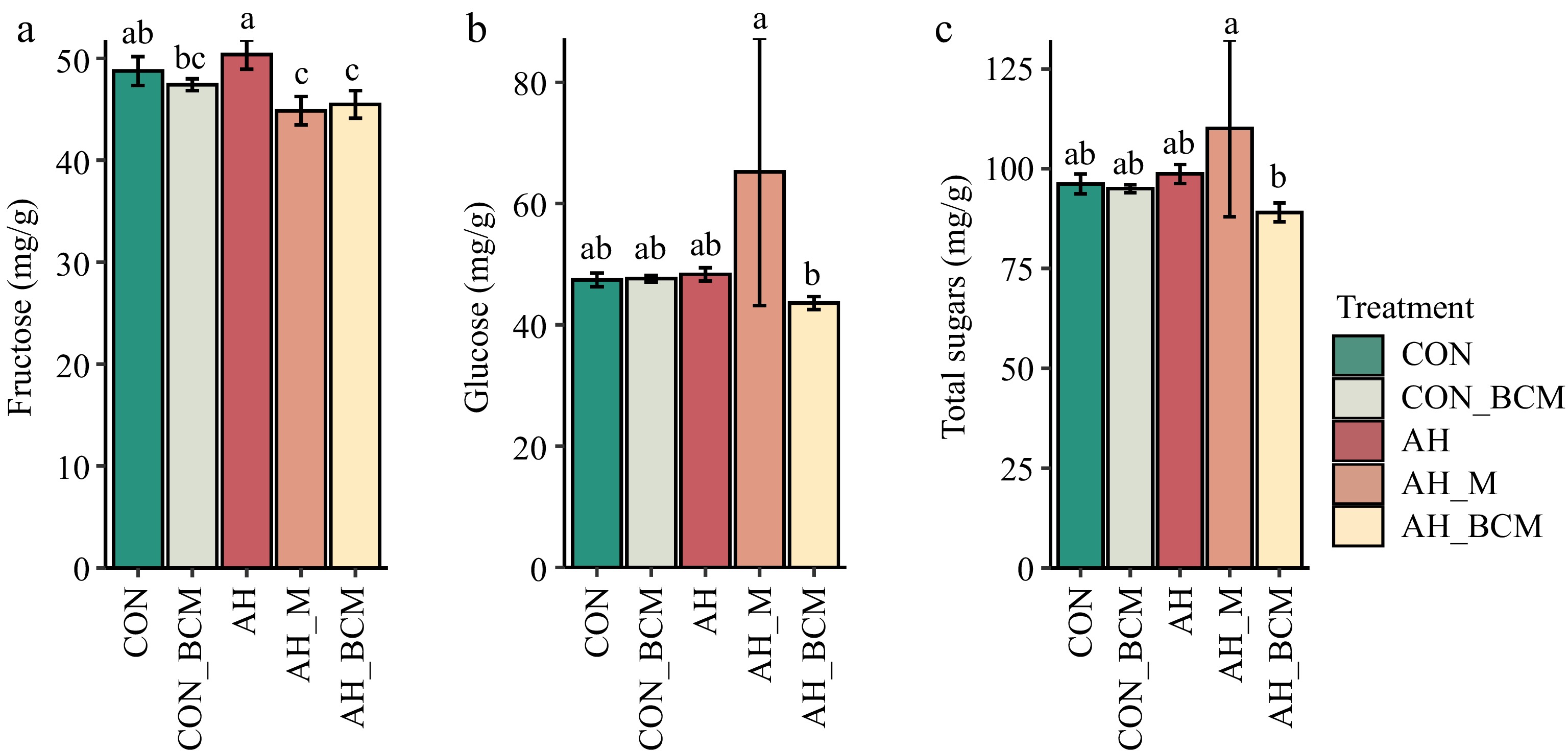 Berry fructose concentration did not significantly differ between the AH and CON plots (Fig. 4a). However, fructose levels were significantly lower (p < 0.05) in AH_M and AH_BCM plots compared with AH. Berry glucose concentration was significantly lower (p < 0.05) in AH_BCM plots than in AH_M plots, but there were no significant differences among CON, CON_BCM, AH, and AH_BCM plots (Fig. 4b). Total soluble sugar concentration did not differ significantly (p > 0.05) among CON, CON_BCM, AH, and AH_BCM plots, but was significantly lower (p < 0.05) in AH_BCM plots compared with AH_M plots (Fig. 4c).