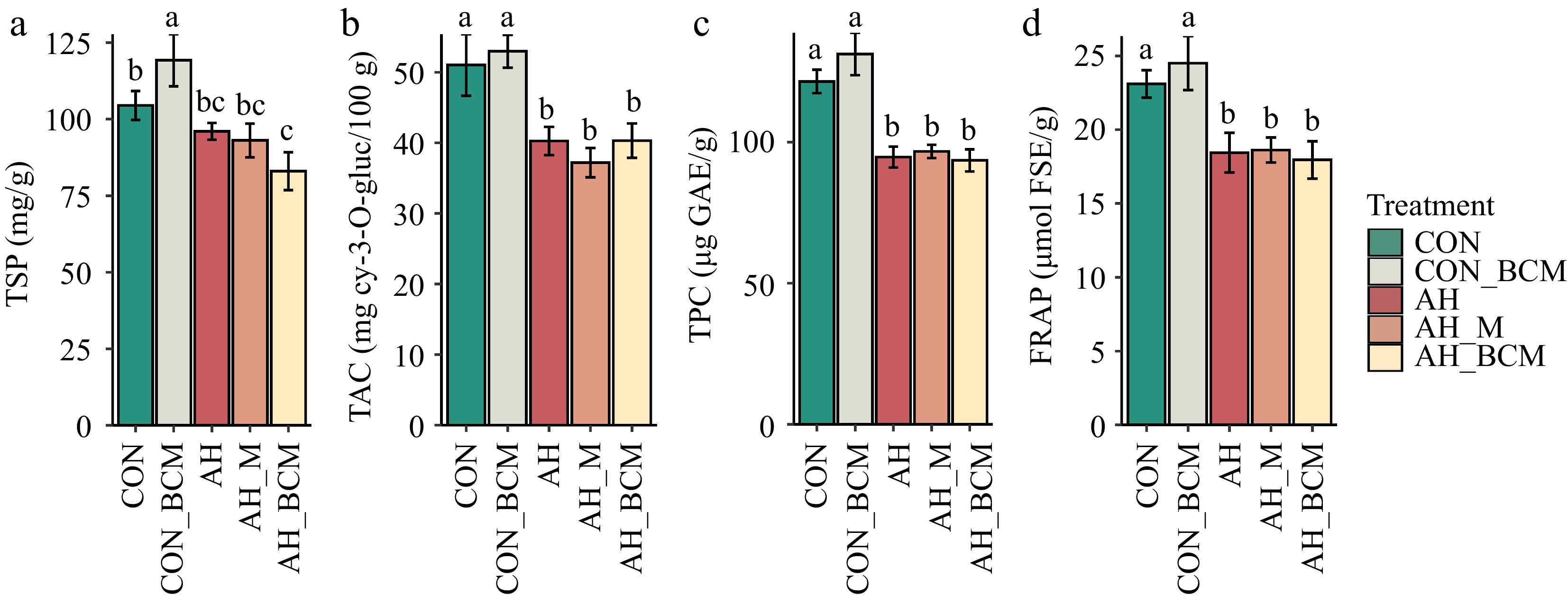 Total soluble protein (TSP) was significantly higher (p < 0.05) in CON_BCM compared with CON (Fig. 5a). TSP was significantly lower (p < 0.05) in AH, AH_M, and AH_BCM compared with CON_BCM, and also significantly reduced in AH_BCM compared with CON (Fig. 5a). No significant differences in total anthocyanins (TAC), phenolic acids (TPC), or antioxidant activities (FRAP) were observed between CON and CON_BCM plots (Fig. 5b–d). However, TAC, TPC, and FRAP were significantly lower (p < 0.05) in all warming-treated plots (AH, AH_M, and AH_BCM) compared with CON and CON_BCM (Fig. 5b–d).