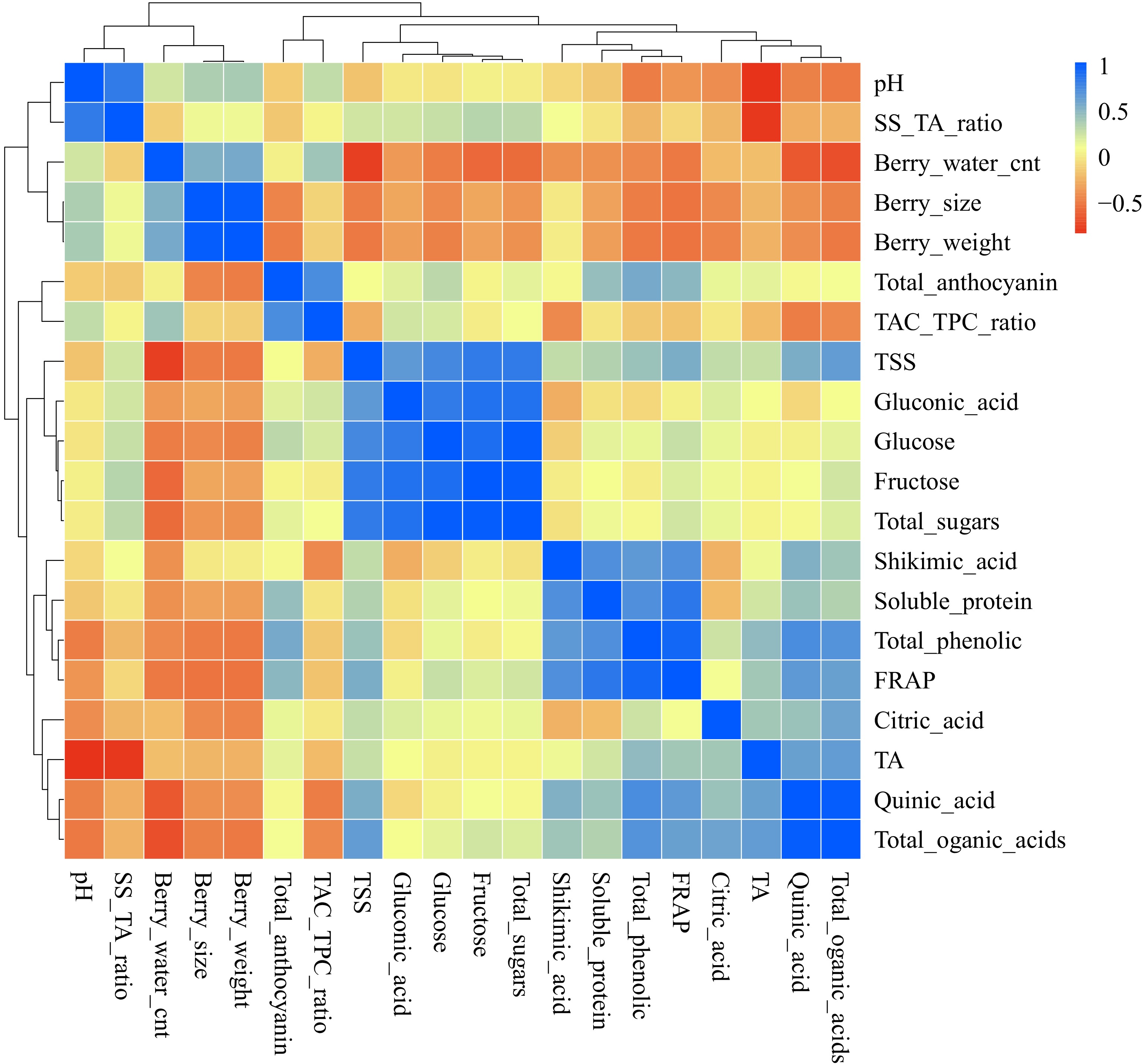 Correlation analysis of nutritional quality traits, metabolites, and antioxidant activities in wild blueberries. Light-yellow boxes indicate traits with no correlations. Traits with cyan to blue colors represent positive correlations, while yellow to red indicate negative correlations. Groupings are as follows: berry pH and ripeness index (TSS/TA ratio); berry water content, size, and weight; anthocyanins and TAC/TPC; total soluble solids, fructose, glucose, and sugar-related compounds; and phenolic acids, antioxidant activities (FRAP), soluble proteins, titratable acidity, total organic acids, citric acids, and quinic acids.