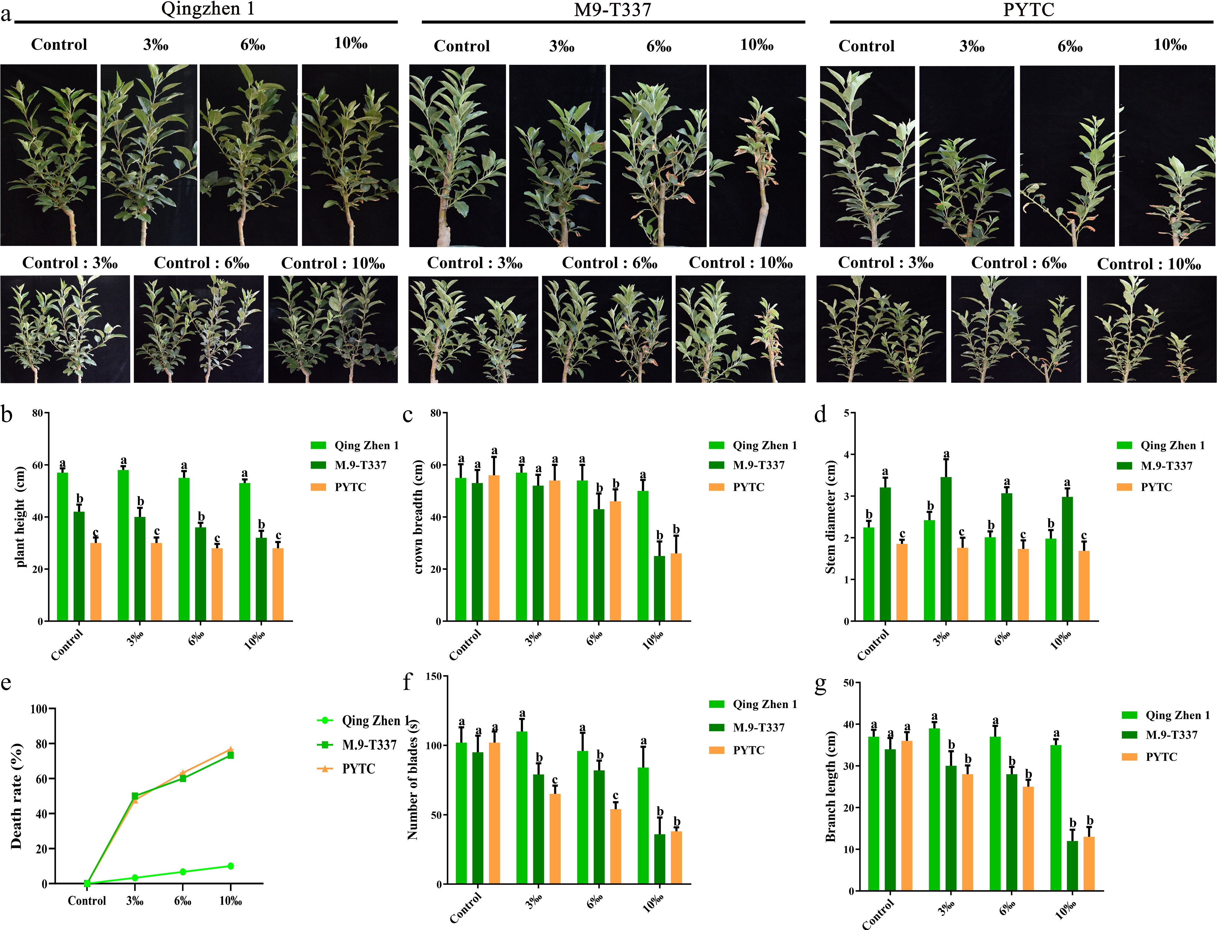 Plant growth indicators under salt stress. (a) The growth phenotypes of Luli/Qingzhen-1, Luli/M9-T337, and 'Luli'/PYTC were studied (1 month after transplanting into saline-alkali soil). (b) Plant height, (c) crown width, (d) stem diameter, (e) mortality rate, (g) branch length, the value is the average± standard error (n ≥ 3), and the letter indicates that there is a significant difference at the p < 0.05 level under each concentration treatment.