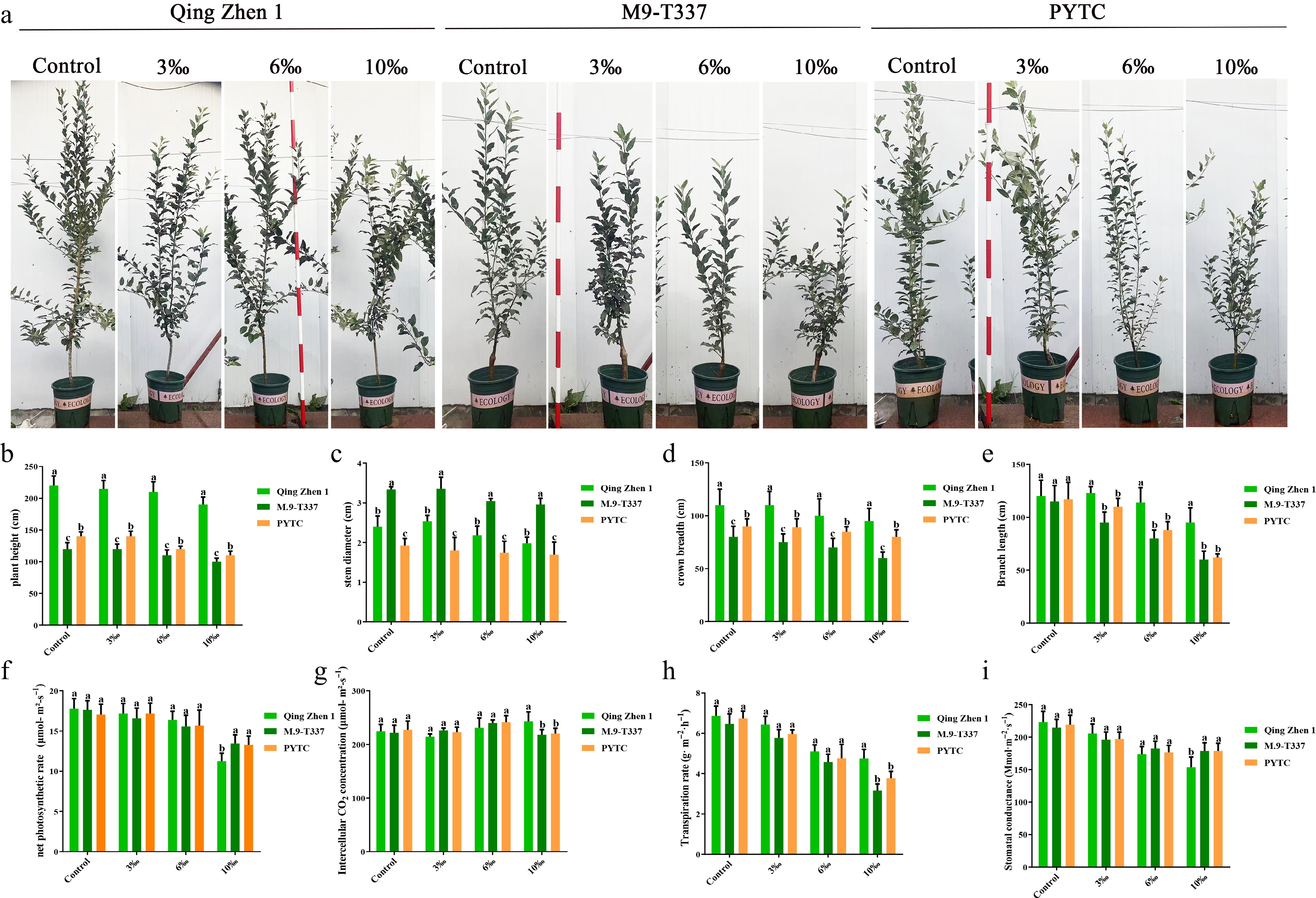 Effects of salt stress on plant growth after 6 months. (a) Rootstock growth performance in later period, (b) tree height, (c) stem diameter, (d) crown width, (e) branch length, (f) net photosynthetic rate, (g) intercellular carbon dioxide concentration, (h) transpiration rate, (i) stomatal conductance. The value was the average ± standard error (n ≥ 3), letters indicate significant differences at p < 0.05 levels.