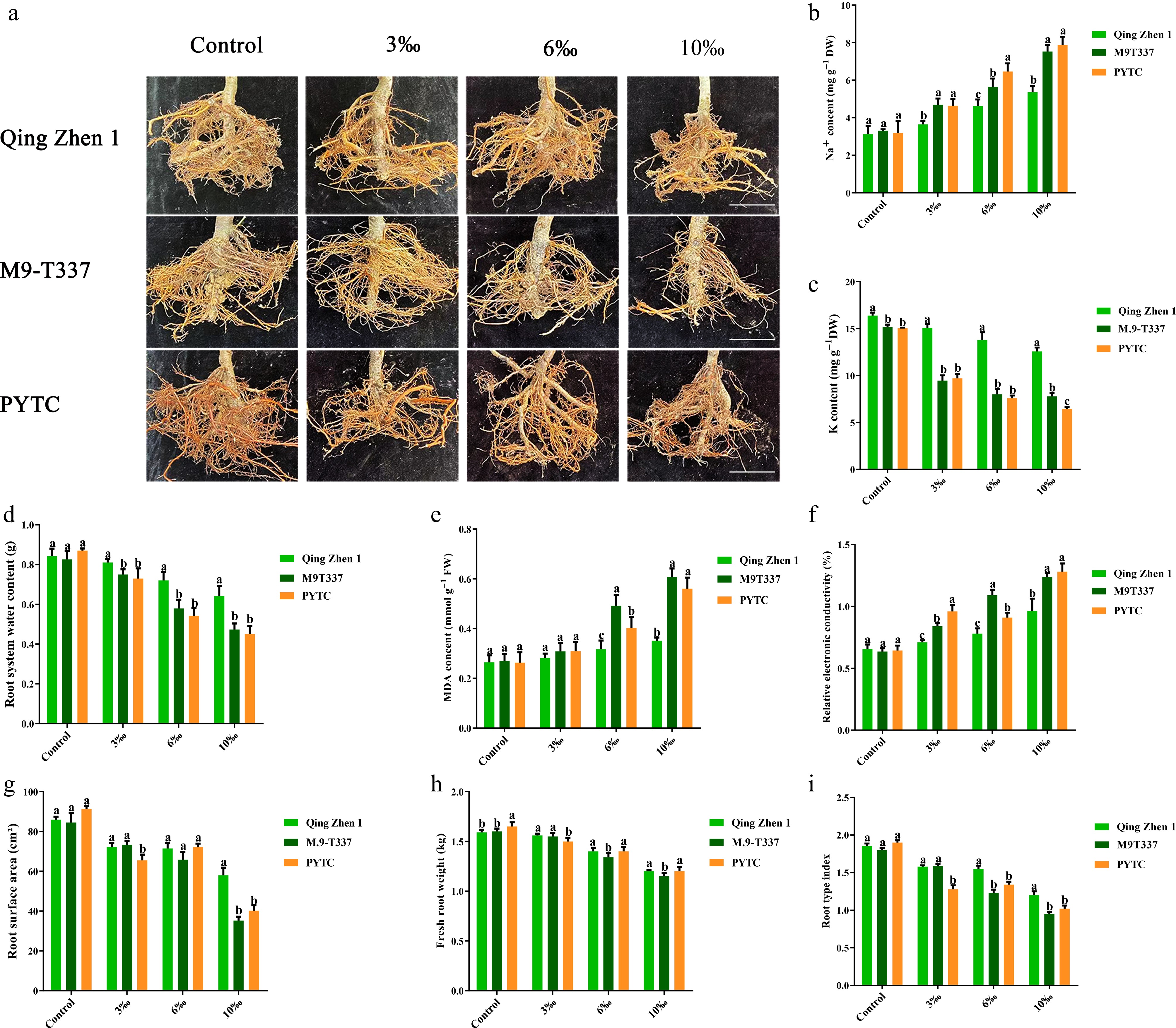 Effects of salt stress on plant roots. (a) Rootstock root phenotype (effects of salt stress on plant growth after 6 months). (b) Na ion content, (c) K ion content, (d) root water content, (e) malondialdehyde content, (f) relative electrical conductivity, (g) root surface area, (h) fresh root weight, (i) plant type index. The value is the mean ± standard error (n ≥ 3), and the letters indicate significant differences at p < 0.05 levels under each concentration treatment. (Bar = 5 cm).