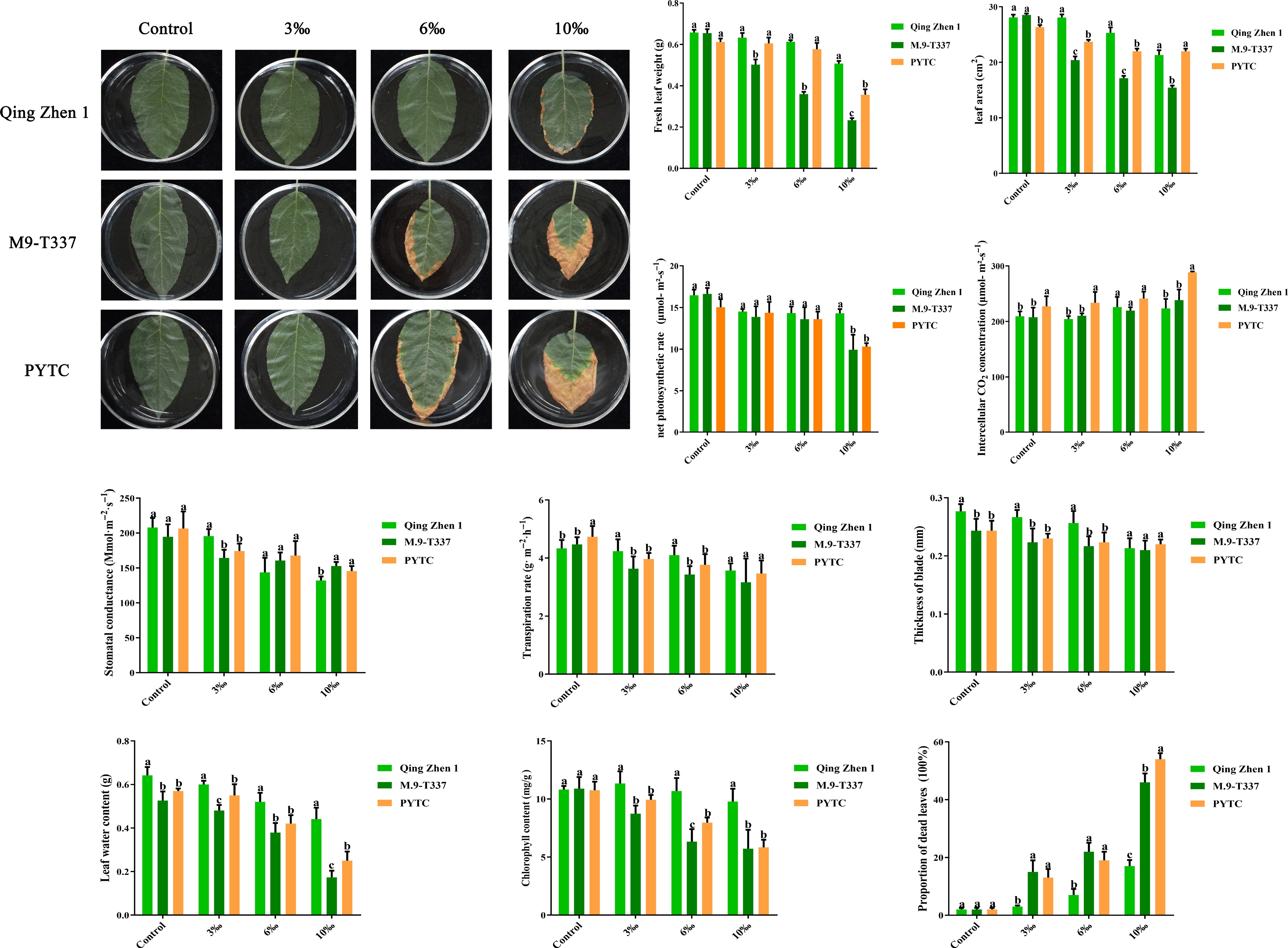 • The growth of the three rootstock–scion combinations were observed and recorded at regular intervals (Fig. 10). Under normal conditions, the trees grew well and relatively uniformly. However, under 10‰ salt stress, the tree structure of Luli/Qingzhen-1 remained intact, while the plant height of Luli/M9-T337 and Luli/PYTC was about 15% lower than that of the control. The plant heights of M9-T337 and PYTC were 41% and 37% lower than the control, respectively (Fig. 10b), showing significant differences compared with the former. In addition, Luli/Qingzhen-1 also showed notable advantages in crown width (Fig. 10d), and branch length (Fig. 10e), both of which were greater than those of Luli/M9-T337 and Luli/PYTC. Luli/M9-T337 and Luli/Qingzhen-1 also had greater stem diameters, which were significantly larger than those of Luli/PYTC (Fig. 10c). As the salt concentration decreased, physiological indicators gradually improved, and tree growth was negatively correlated with salt concentration. Photosynthetic parameters in the three combinations were then assessed. The net photosynthetic rate (Fig. 10f), stomatal conductance (Fig. 10i), and transpiration rate (Fig. 10h) decreased with increasing salt concentration, while intercellular CO2 concentration (Fig. 10g) increased slightly and remained relatively stable. However, the photosynthetic rate of Luli/Qingzhen-1 remained higher than that of Luli/M9-T337 and Luli/PYTC.