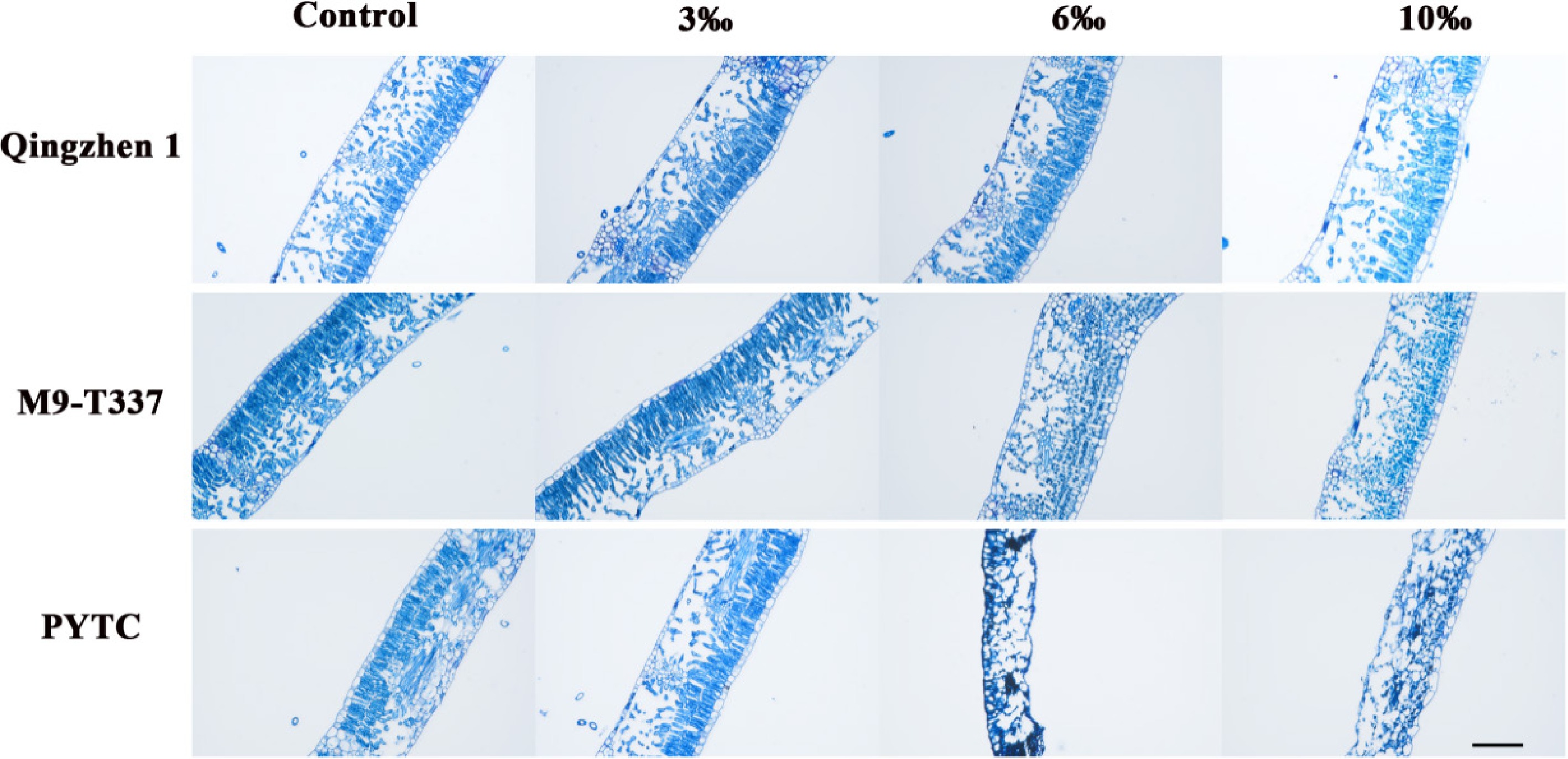 Effects of salt stress on plant leaf structure. Scale bars: 500 µm (2 months after transplanting into saline-alkali soil).