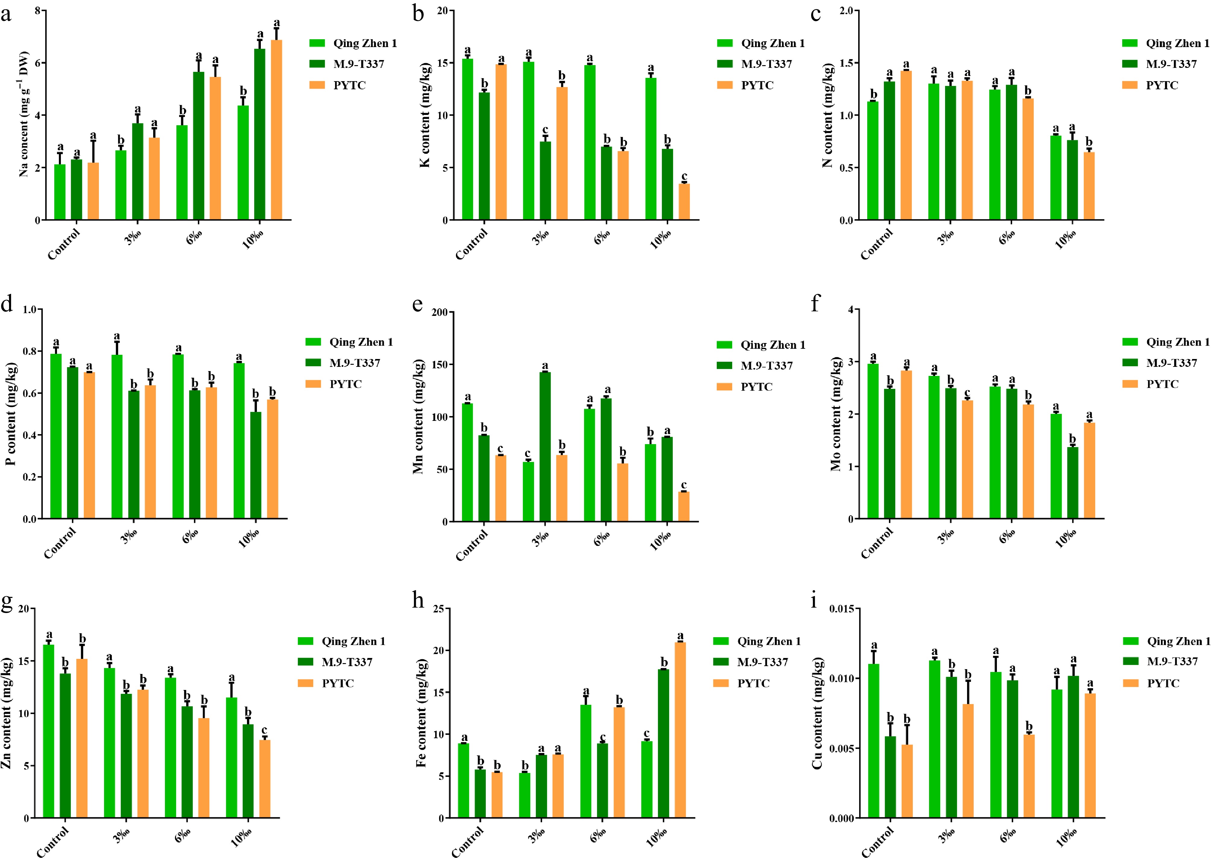 Metal ion content (2 months after transplanting into saline-alkali soil). (a) Na ion content, (b) K ion content, (c) N ion content, (d) P ion content, (e) Mn ion content, (f) Mo ion content, (g) Zn ion content, (h) Fe ion content, (i) Cu ion content. The value is the average ± standard error (n ≥ 3), the letter indicates that there is a significant difference at the p < 0.05 level under each concentration treatment.