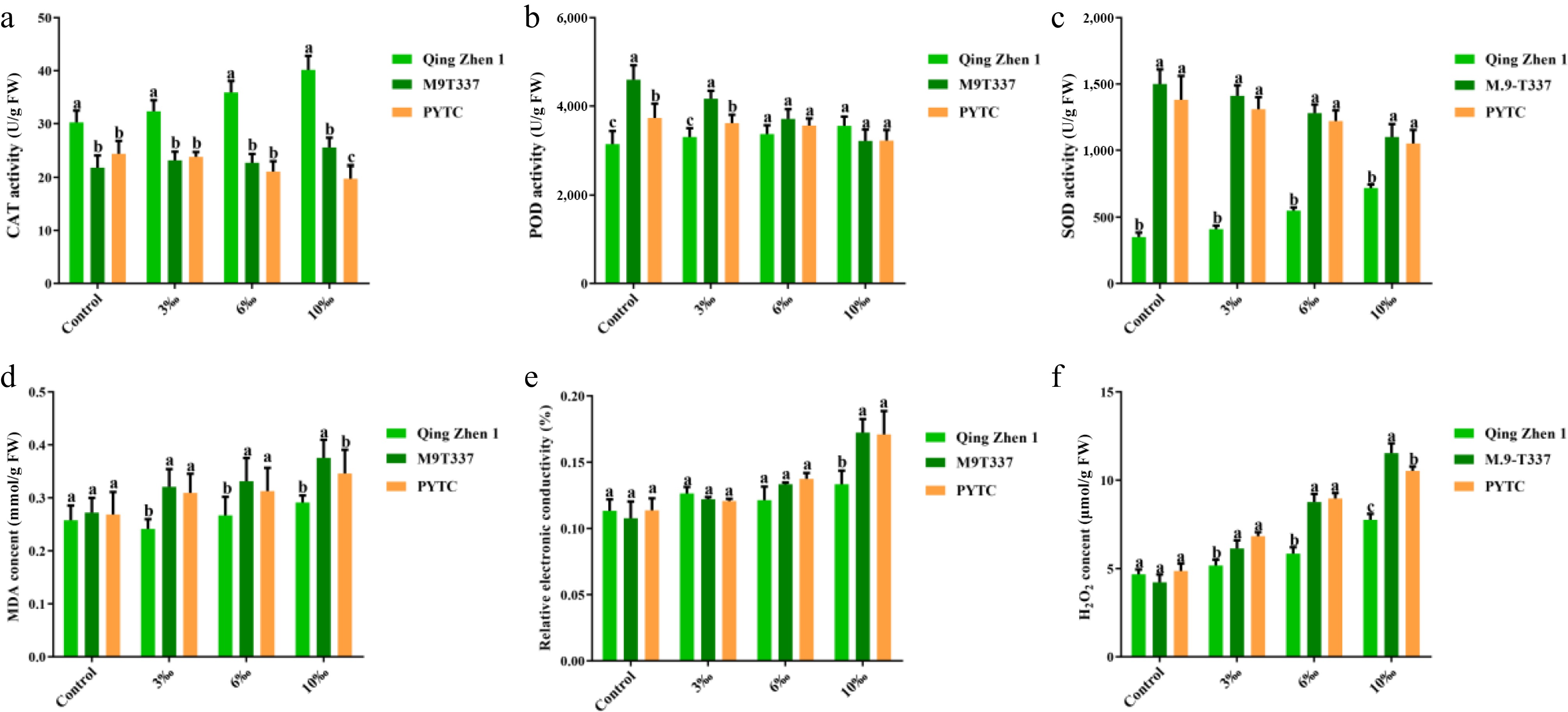 Activity of antioxidant enzymes and contents of MDA and REC in plants under salt stress (2 months after transplanting into saline-alkali soil). (a) CAT activity, (b) POD activity, (c) SOD activity, (d) MDA content, (e) relative electrolytic leakage, (f) hydrogen peroxide content. The value is the average ± standard error (n ≥ 3), the letter indicates that there is a significant difference in the p < 0.05 level under each concentration treatment.