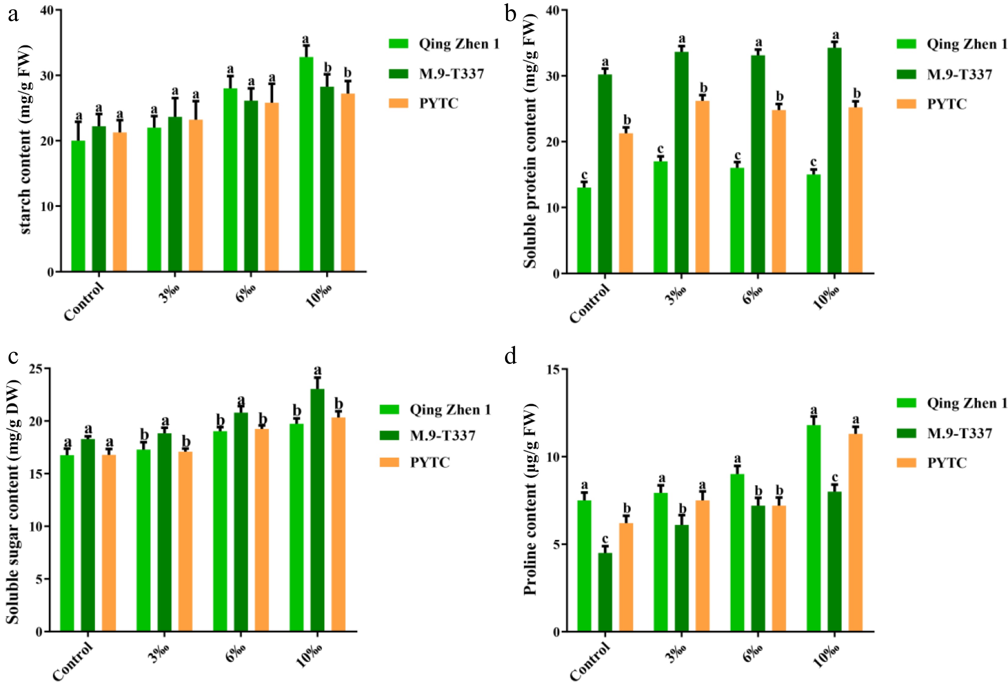 Contents of osmoregulatory substances in plants under salt stress (2 months after transplanting into saline-alkali soil). (a) Starch content, (b) soluble protein content, (c) soluble sugar content, (d) proline content, the value is the average ± standard error (n ≥ 3), the letter indicates that there is a significant difference in the p < 0.05 level under each concentration treatment.