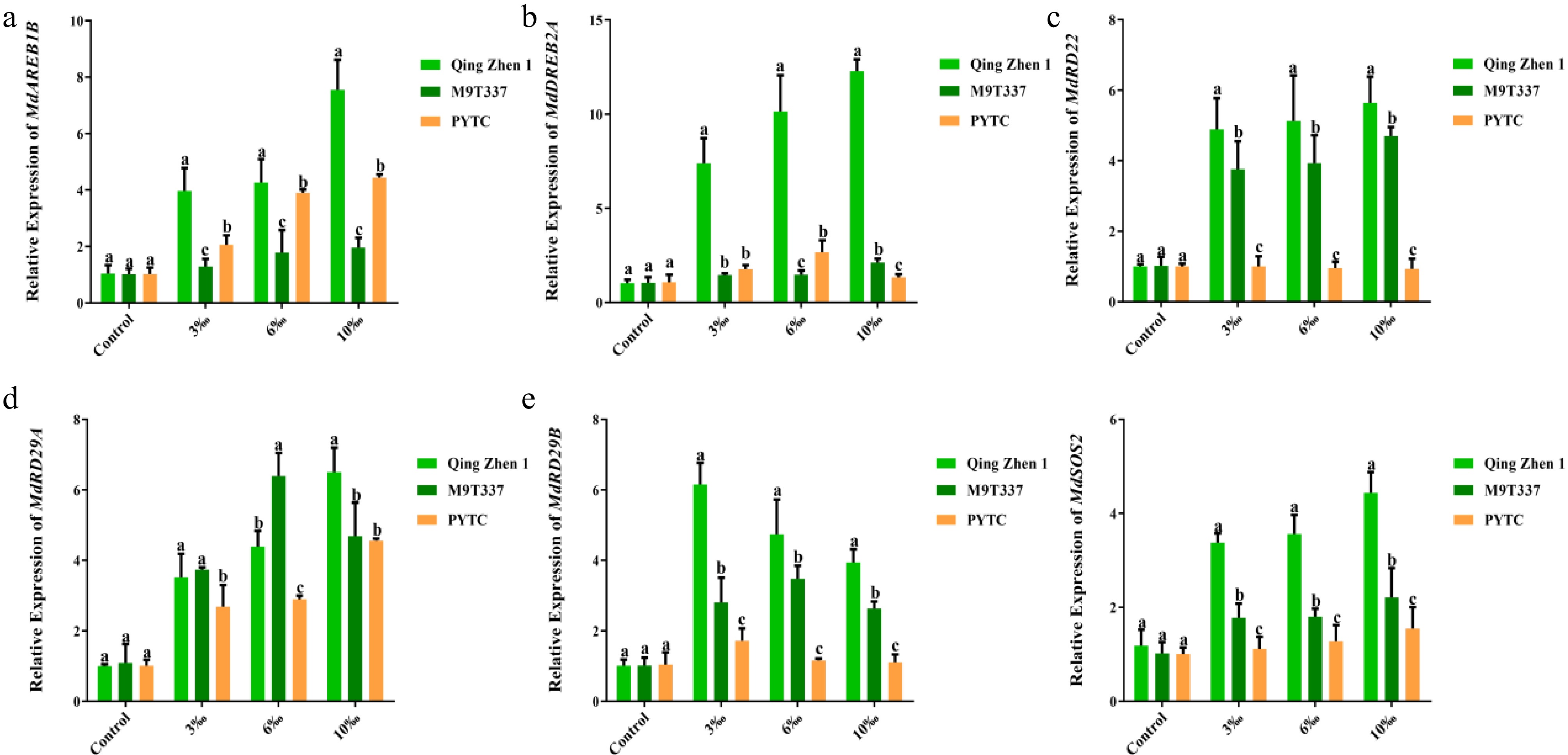 Expression of related genes in plants under salt stress (2 months after transplanting into saline-alkali soil). Expression of (a) MdAREB1B, (b) MdDREB2A, (c) MdRD22, (d) MdRD29A, (e) MdRD29B, (f) MdSOS2. The value is the mean ± standard error (n ≥ 3), letters indicate significant differences at the p < 0.05 level for each concentration treatment.