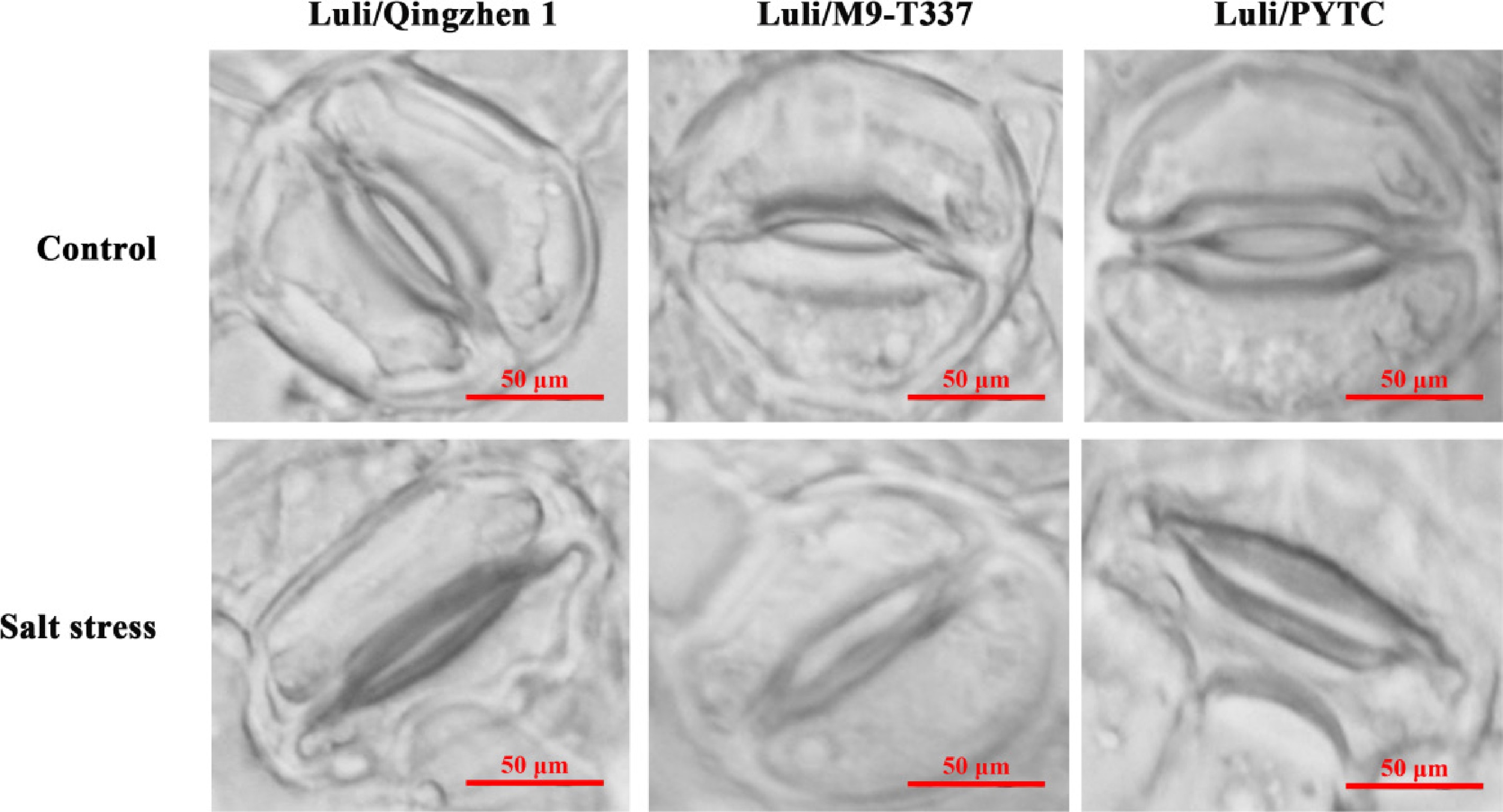 • The stomata movement is also regulated by several environmental factors, such as light intensity, drought, and salt stress[40]. Stomata play a key role in gas exchange between the plant and the environment. Under normal conditions, the stomatal opening and closing of the three rootstock–scion combinations were roughly the same, with no significant differences (Fig. 8). However, under 10‰ salt stress, the stomatal closure of Luli/Qingzhen-1 was greater than that of the other two combinations. These results suggest that Luli/Qingzhen-1 may resist salt stress by regulating the degree of stomatal opening and closure.