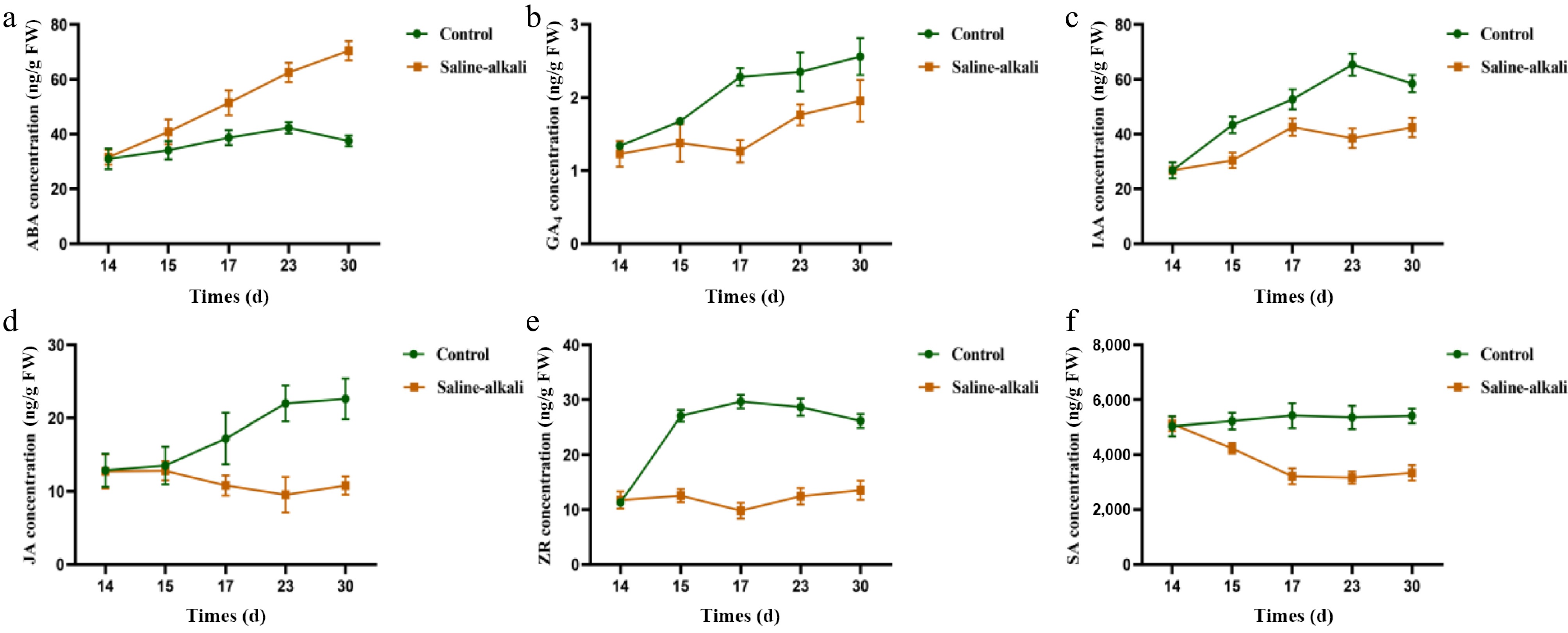 Effects of more resistant rootstock hormones under salt stress (2 months after transplanting into saline-alkali soil). (a) ABA content, (b) GA4 content, (c) IAA content, (d) JA content, (e) ZR content, (f) SA content. The value is the mean ± standard error (n = 10).