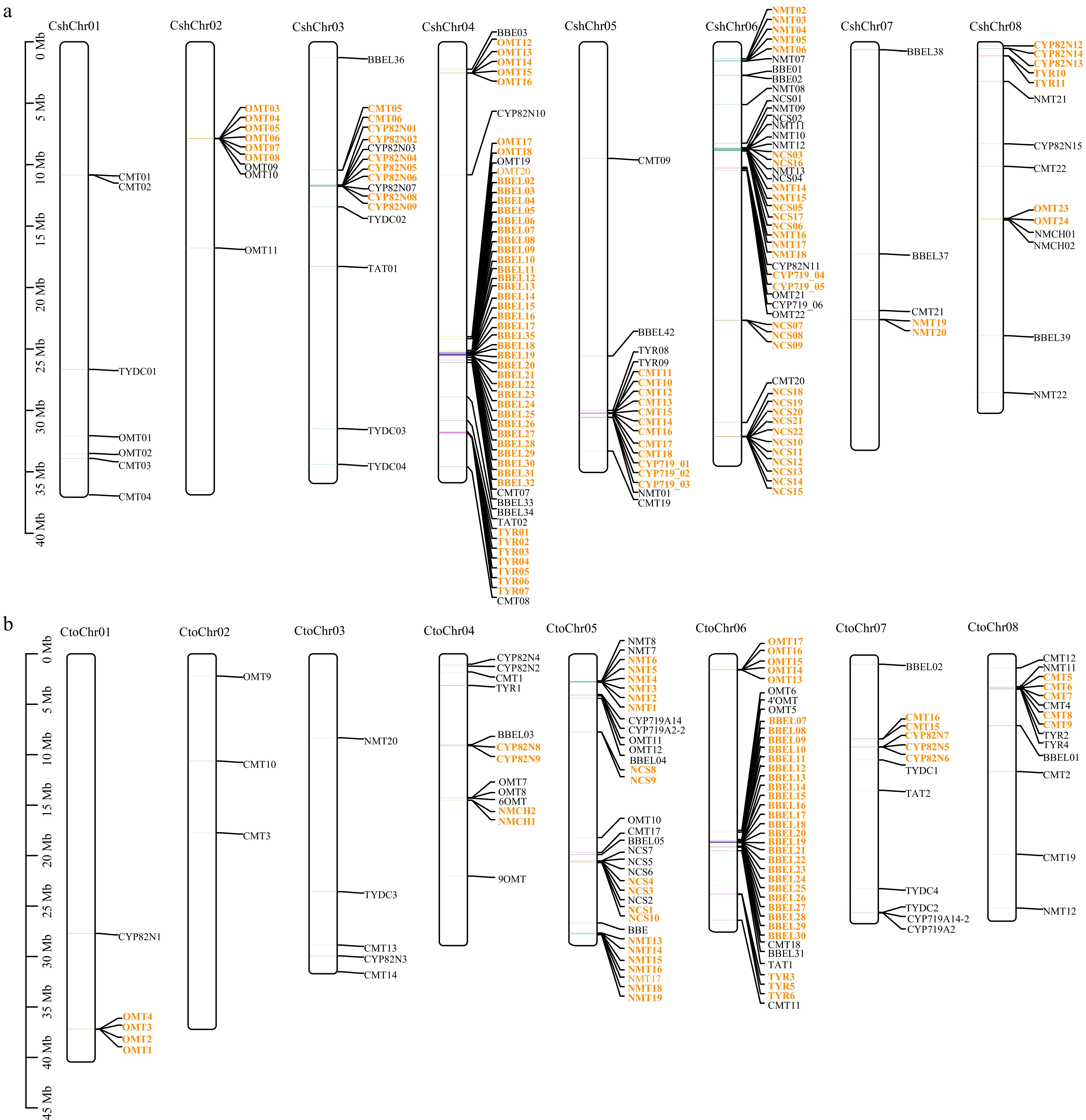Chromosome location and duplication event analyses of BIA biosynthesis genes in (a) C. sheareri and (b) C. tomentella. The chromosome number is indicated at the top of each chromosome. Tandem duplicated genes are indicated with orange color. The scale bar on the left indicates the length (mb) of chromosomes. The gene and species abbreviations were the same as Fig. 3. Chr, chromosome.