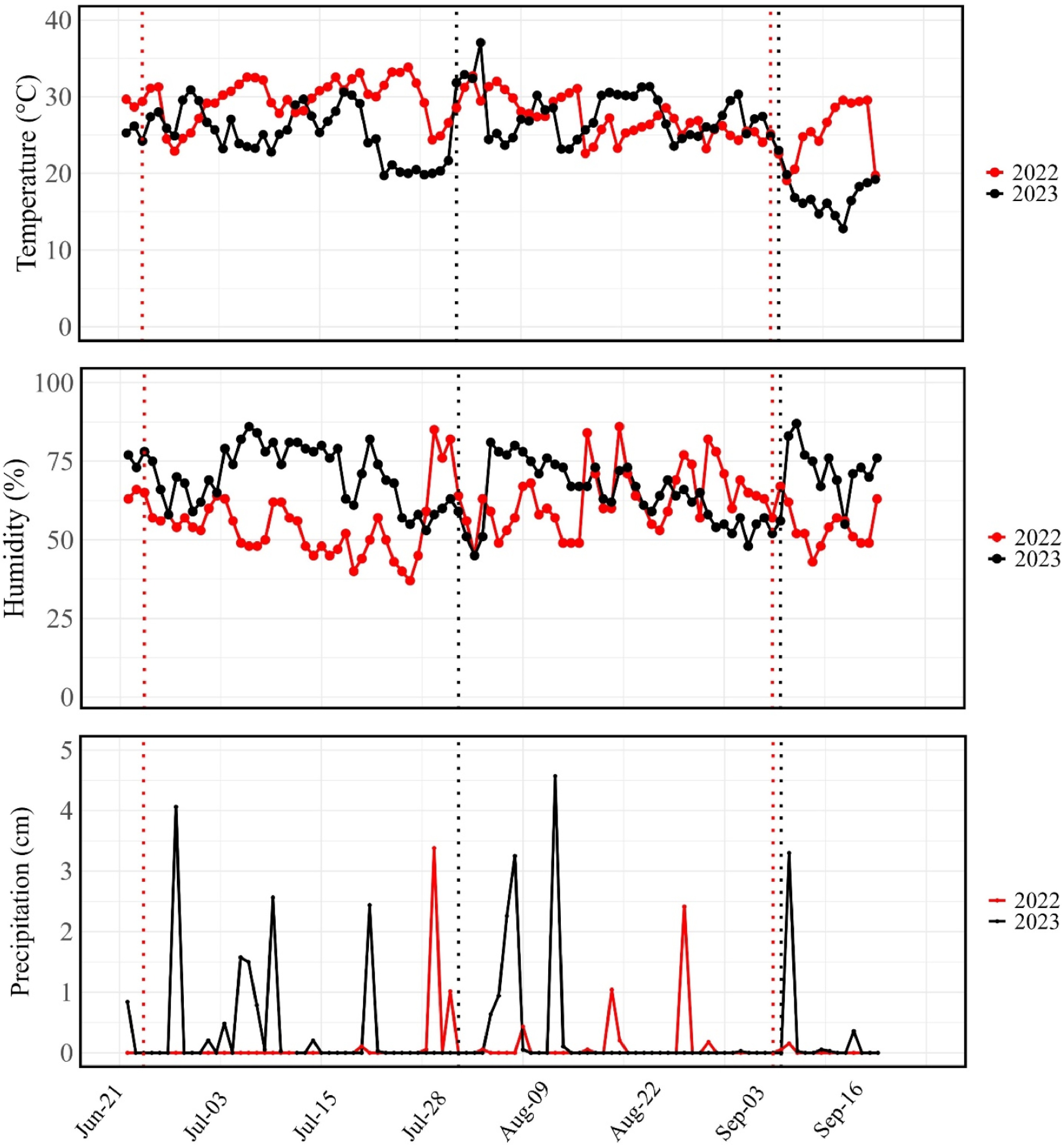 Daily mean temperature, humidity, and precipitation during summer season (June 20 to September 20) in 2022 and 2023. Vertical lines represent the first and final day of data collection in 2022 (red) and 2023 (black). Data was retrieved from the Oklahoma Mesonet (www.mesonet.org).