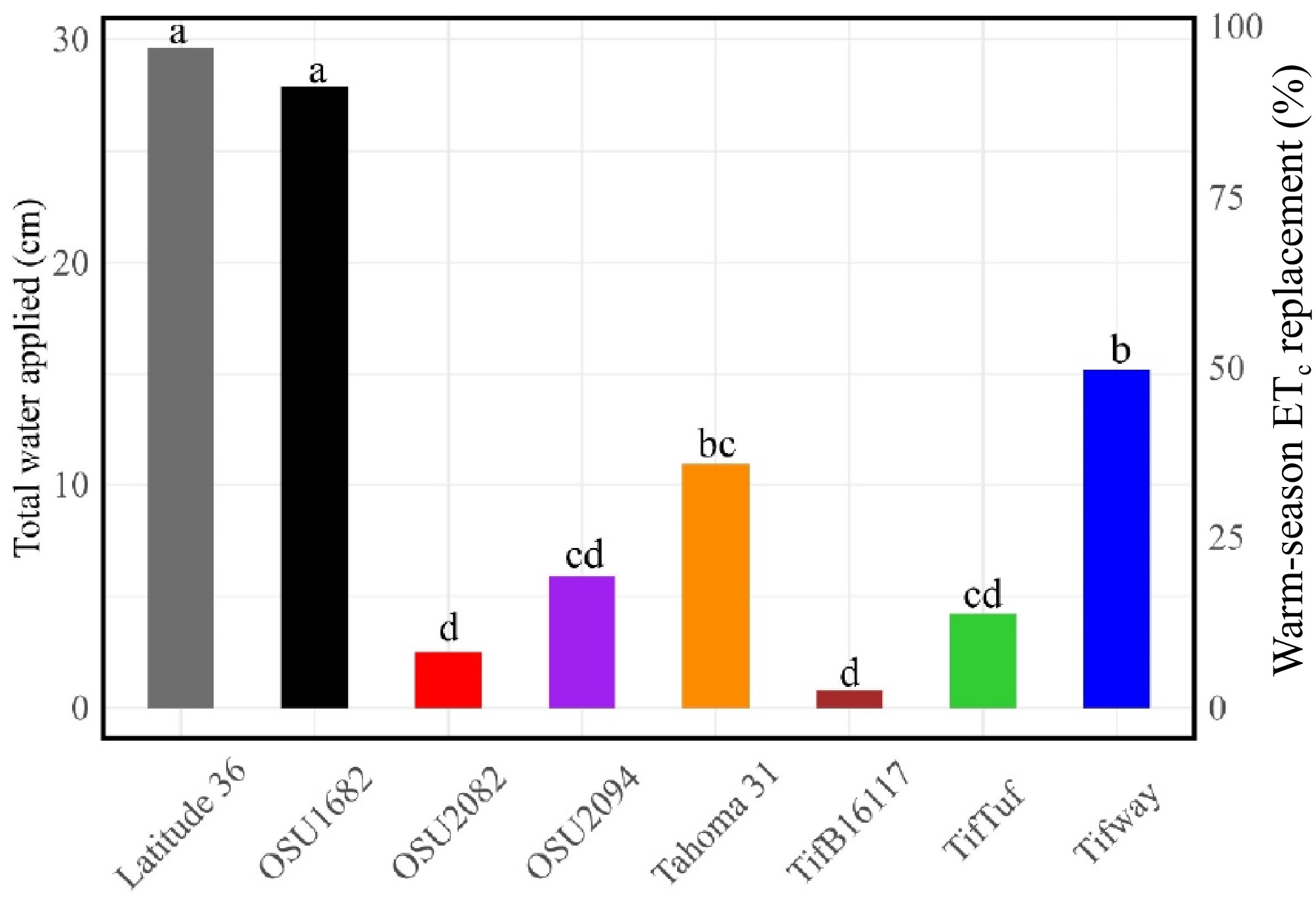 Total water application amounts and corresponding percentages of warm-season evapotranspiration (ETc) replacement for different bermudagrass genotypes over a 78-d period (June 23 to September 9) in 2022. Vertical bars labeled with the same letter indicate no significant difference, as determined by Fisher's protected LSD test, p = 0.05.
