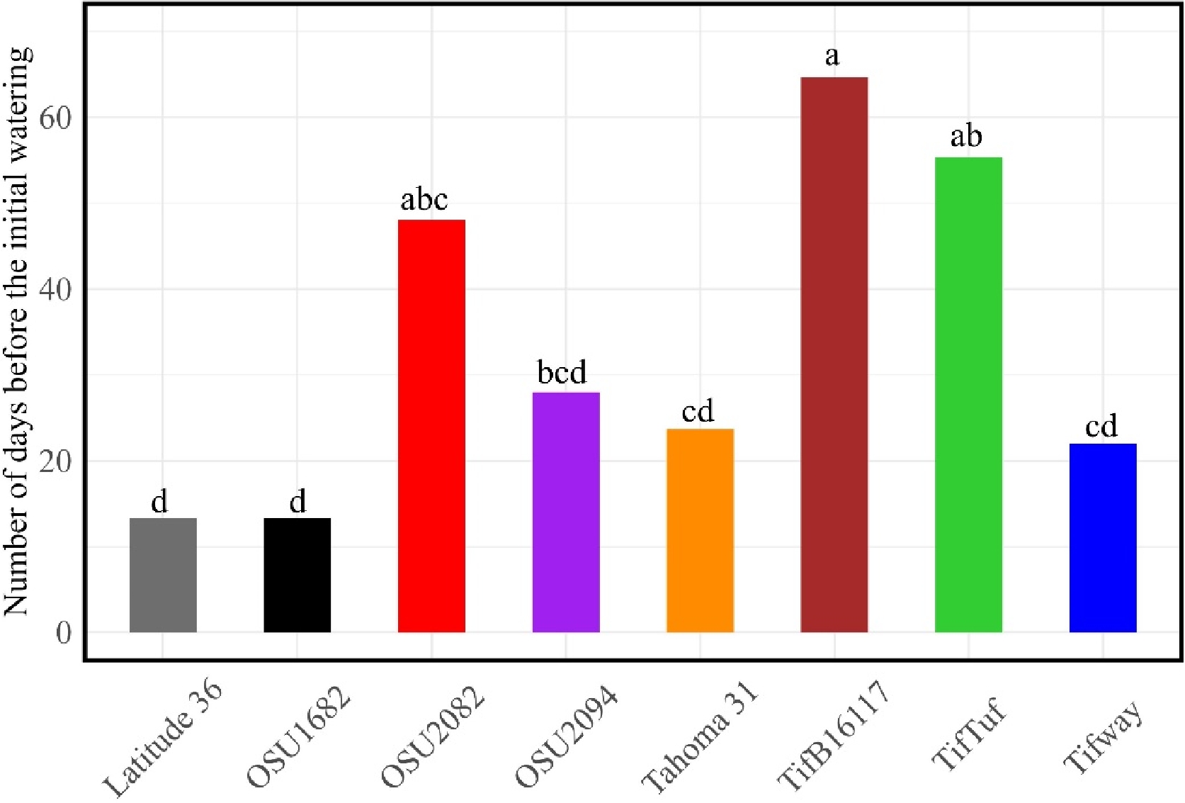 Number of days under drought before the initial watering event over a 78-d period (June 23 to September 9) in 2022. Vertical bars with same letter are not significantly different, according to Fisher's protected LSD, p = 0.05.