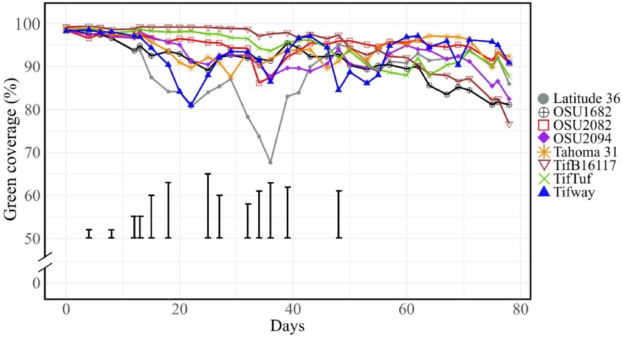 Percent green coverage of the genotypes over the 78 d in 2022 was shown in Fig. 4. With the wilt-based threshold irrigation approach, most genotypes maintained above the threshold of 75% coverage, except for Latitude 36, which dropped to 67% on day 36, though irrigation was applied 2 d prior. TifB16117 maintained greater than 97% green coverage for up to 48 d without any irrigation. Throughout the study, Tahoma 31 maintained a PGC higher than 87%, and 'Tifway' maintained PGC levels above 86%.
