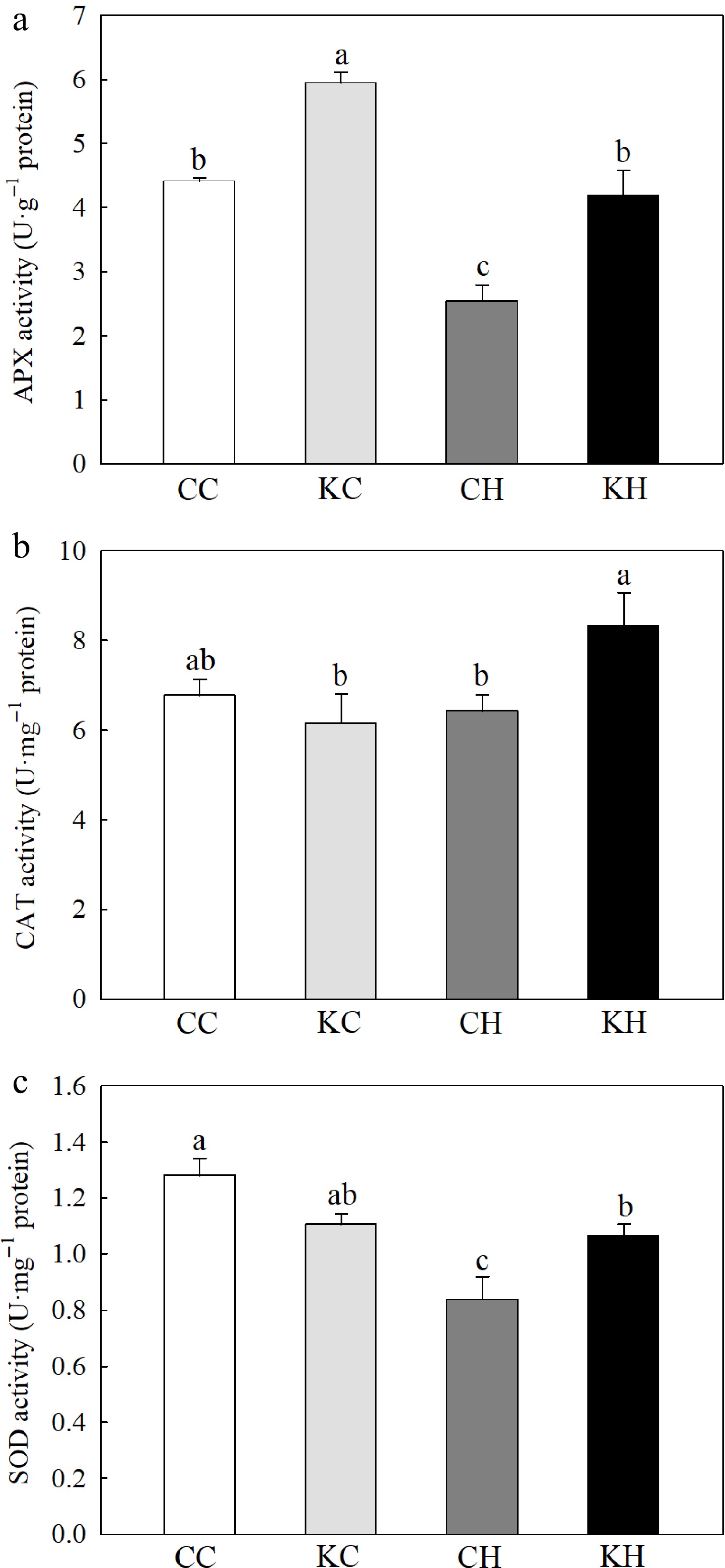 Effects of KAR1 on (a) APX activity, (b) CAT activity, and (c) SOD activity in leaves of creeping bentgrass exposed to optimal temperature and heat stress. CC, foliar application of water + optimal temperature; KC, foliar application of 100 nM KAR1 + optimal temperature; CH, foliar application of water + heat stress; KH, foliar application of 100 nM KAR1 + heat stress. Data shown are the mean ± SE of four biological replicates. Bars not sharing a common letter indicate significant differences at p < 0.05 level.