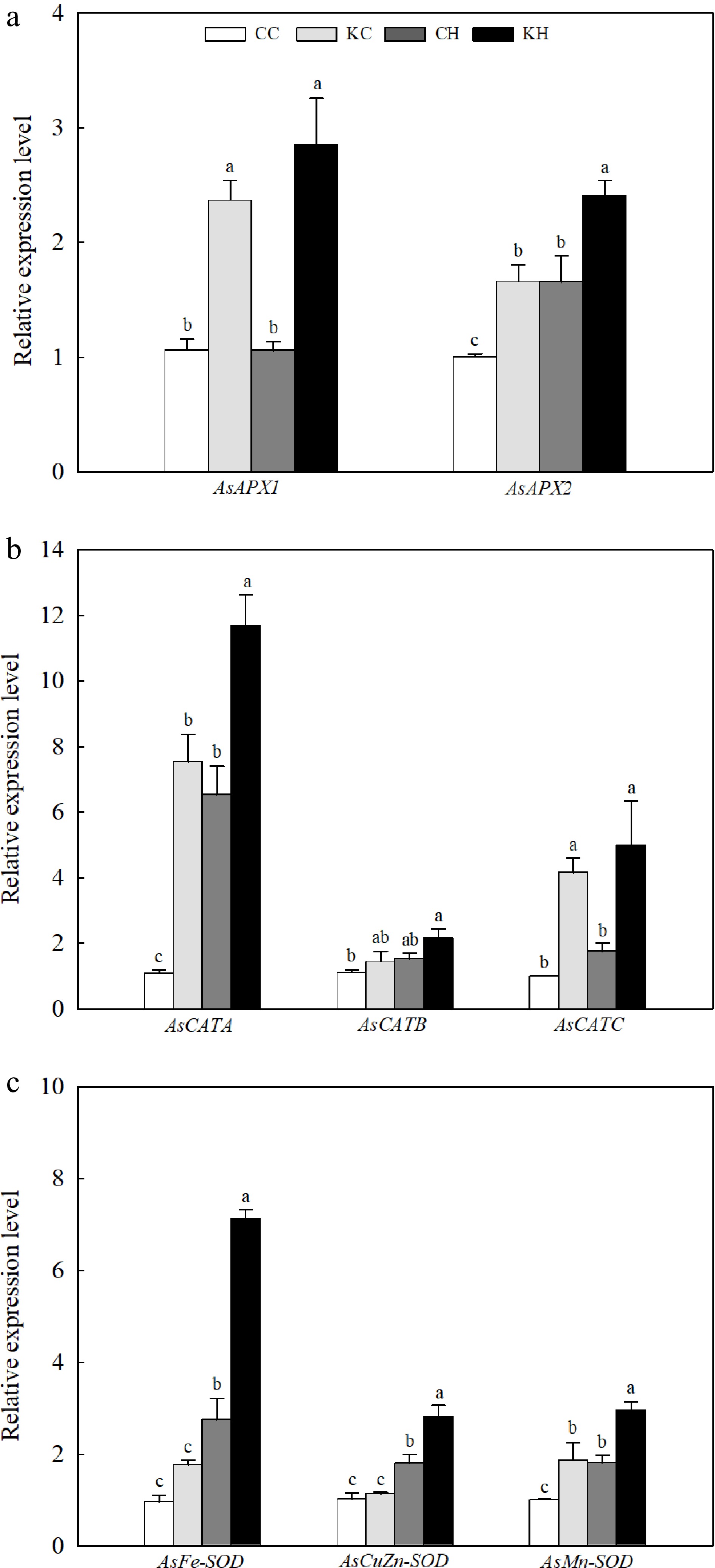 Under optimal temperature, the expression levels of AsAPX1 and AsAPX2 in KAR1-treated plants exhibited a 2.23-fold and 1.66-fold increase, respectively, compared to those treated with water (Fig. 3a). Exogenous application of KAR1 significantly elevated the expression levels of AsAPX1 and AsAPX2 (by 2.70-fold and 1.46-fold) under heat stress (Fig. 3a). Under optimal temperature, KAR1 treatment significantly enhanced the expression levels of AsCATA and AsCATC (by 6.00-fold and 4.16-fold) but had no significant effect on AsCATB (Fig. 3b). Under heat stress, compared with water-treated plants, the expression levels of AsCATA and AsCATC were significantly induced by KAR1 treatment (1.79- and 2.82-fold, respectively) (Fig. 3b). Heat stress significantly increased the expression levels of three SOD-encoding genes (AsFe-SOD, AsCuZn-SOD, and AsMn-SOD), and the expression levels of AsFe-SOD, AsCuZn-SOD, and AsMn-SOD in KAR1-treated plants were significantly higher than those in water-treated plants (Fig. 3c). Under optimal temperature, the expression level of AsMn-SOD was significantly higher in KAR1-treated (1.85-fold) plants after 24 h of heat stress compared to water-treated control (Fig. 3c).