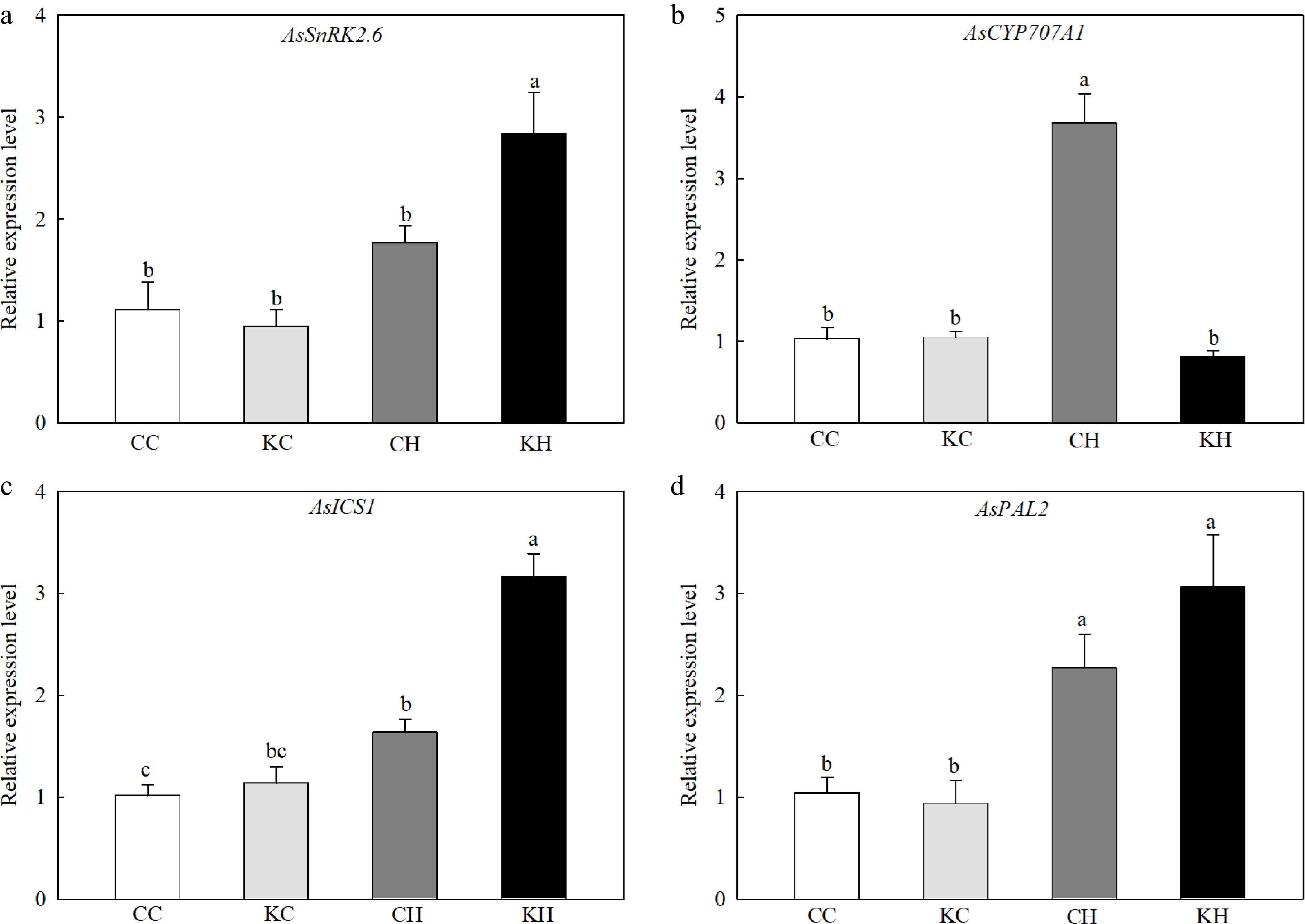 Effects of KAR1 on expression of (a) AsSnRK2.6, (b) AsCYP707A1, (c) AsICS1, and (d) AsPAL2 in leaves of creeping bentgrass exposed to optimal temperature and heat stress. CC, foliar application of water + optimal temperature; KC, foliar application of 100 nM KAR1 + optimal temperature; CH, foliar application of water + heat stress; KH, foliar application of 100 nM KAR1 + heat stress. Data shown are the mean ± SE of four biological replicates. Bars not sharing a common letter indicate significant differences at p < 0.05 level.