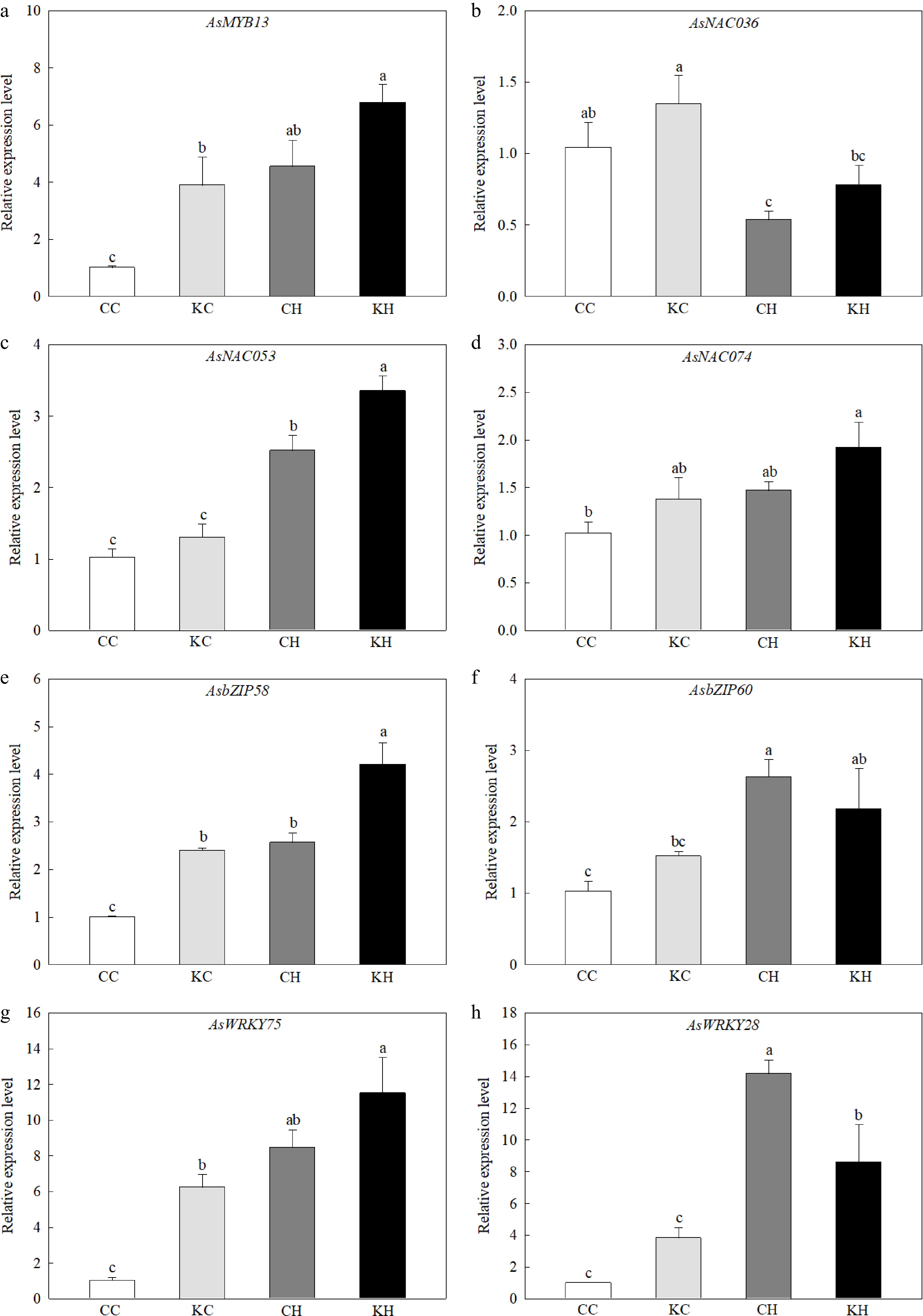 Effects of KAR1 on expression of (a) AsMYB13, (b) AsNAC036, (c) AsNAC053, (d) AsNAC074, (e) AsbZIP58, (f) AsbZIP60, (g) AsWRKY75, and (h) AsWRKY28 in leaves of creeping bentgrass exposed to optimal temperature and heat stress. CC, foliar application of water + optimal temperature; KC, foliar application of 100 nM KAR1 + optimal temperature; CH, foliar application of water + heat stress; KH, foliar application of 100 nM KAR1 + heat stress. Data shown are the mean ± SE of four biological replicates. Bars not sharing a common letter indicate significant differences at p < 0.05.