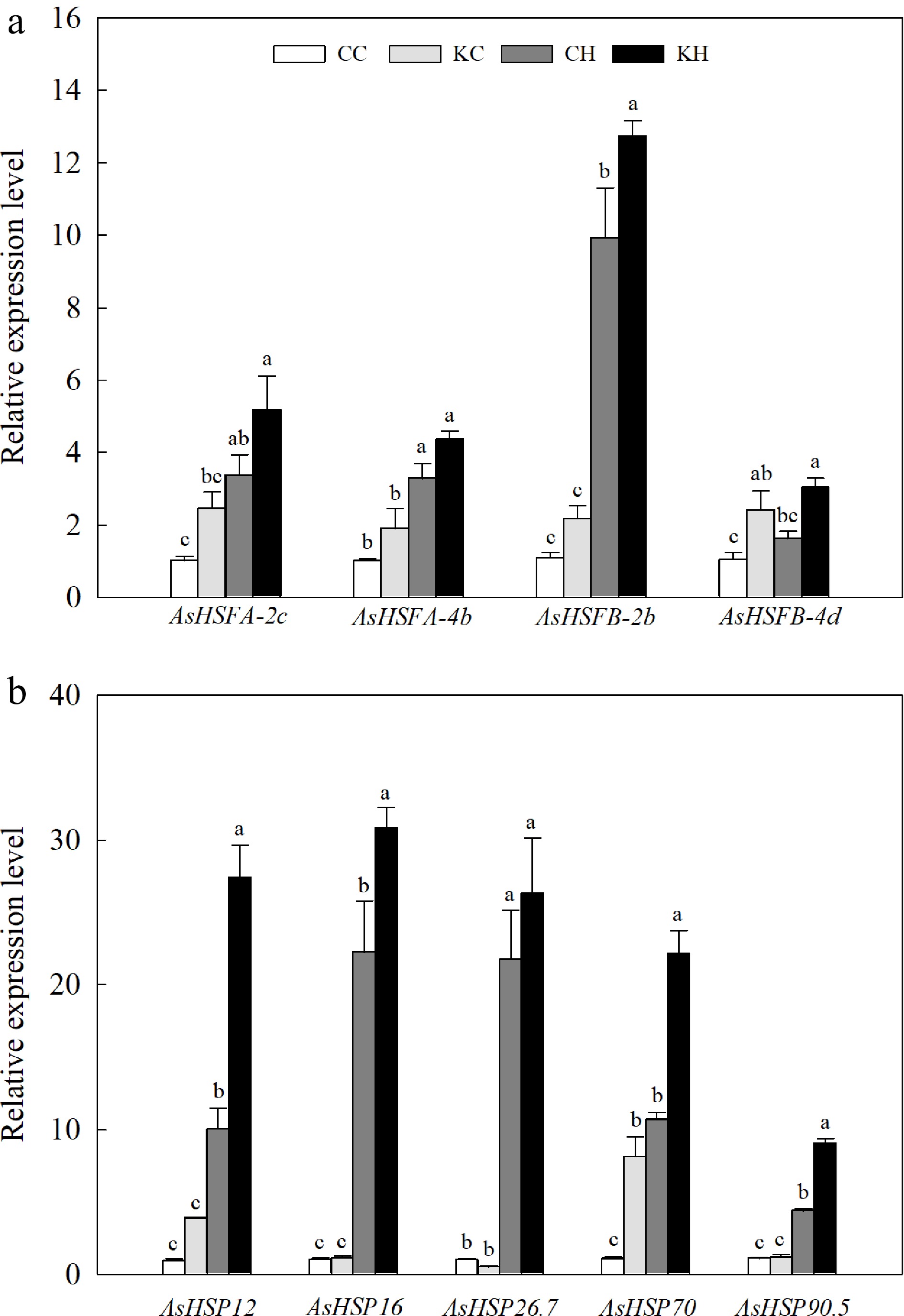 Heat stress significantly increased the expression levels of three HSFs (AsHSFA-2c, AsHSFA-4b, and AsHSFB-2b) and five HSPs (AsHSP12, AsHSP16, AsHSP26.7, AsHSP70, and AsHSP90.5). KAR1-treated plants exhibited significant higher transcription levels of AsHSFB-2b (1.28-fold), AsHSFB-4d (1.87-fold), as well as four HSPs (AsHSP12, 2.73-fold; AsHSP16, 1.39-fold; AsHSP70, 2.07-fold, and AsHSP90.5, 2.06-fold) under heat stress (Fig. 7a, b). Under optimal temperature, application of KAR1 induced the expression levels of AsHSFB-4d and AsHSP70 by 2.32-fold and 7.55-fold, compared to water-treated control, respectively (Fig. 7a, b).