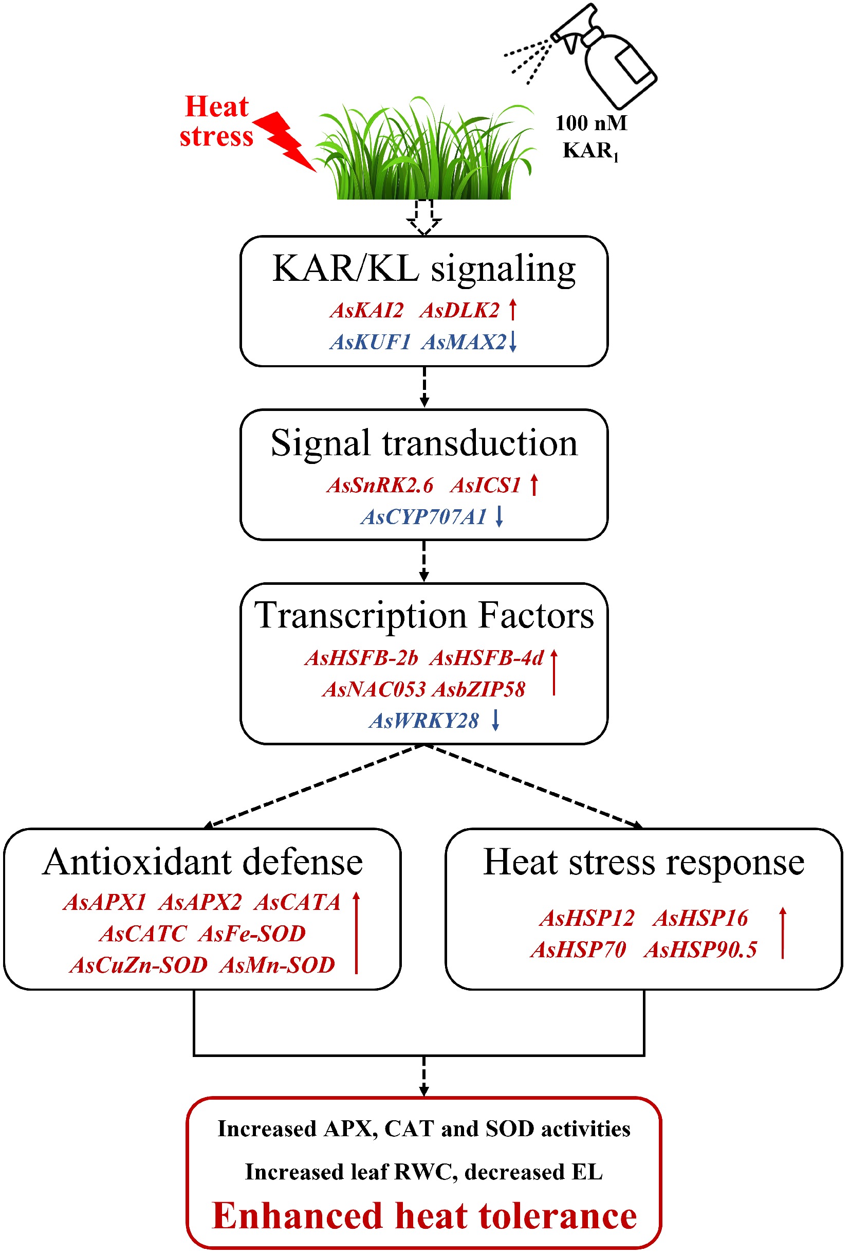 Schematic diagram illustrating the mechanism of KAR1 enhances the heat tolerance of creeping bentgrass. Under heat stress, foliar application of KAR1 up-regulated the expression of KAR/KL signal transduction genes (AsKAI2, AsDLK2), hormone biosynthesis and signaling genes (AsSnRK2.6, AsICS1), transcription factors (AsHSFB-2b, AsHSFB-4d, AsNAC053, AsbZIP58), antioxidant defense genes (AsAPX1, AsAPX2, AsCATA, AsCATC, AsFe-SOD, AsCuZn-SOD, AsMn-SOD), and heat shock proteins (AsHSP12, AsHSP16, AsHSP70, AsHSP90.5), while down-regulated the expression of KAR/KL signal transduction genes (AsMAX2, AsKUF1), phytohormone catabolism gene (AsCYP707A1), and transcription factor (AsWRKY28), resulting in enhanced heat tolerance (increased leaf RWC, decreased EL, and increased activities of APX, CAT and SOD) of creeping bentgrass.