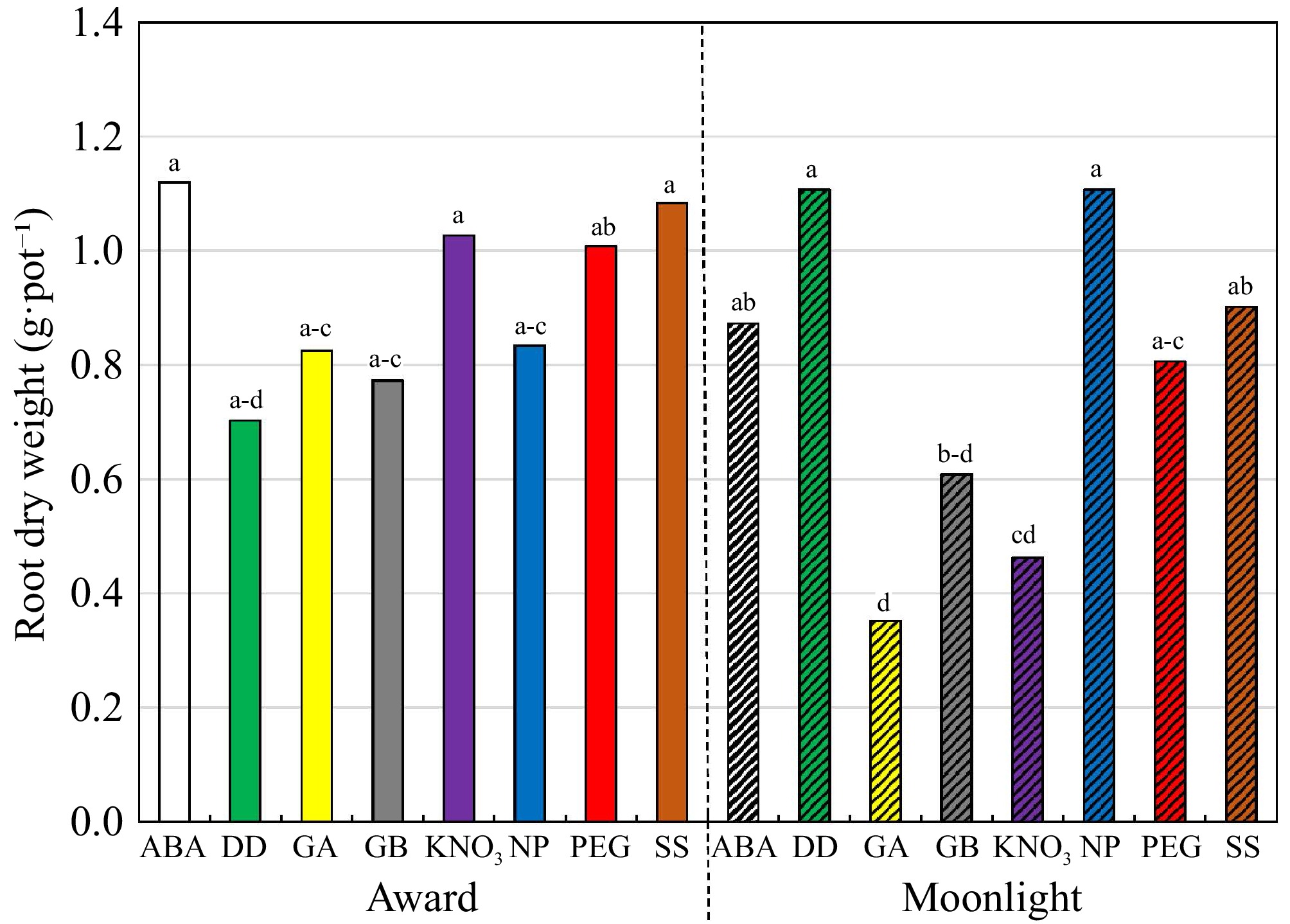 Shoot dry weight (g·pot−1) of 'Award' and 'Moonlight' (hashed) Kentucky bluegrass seedlings as affected by the cultivar × growing condition × priming interaction. The priming treatments are: abscisic acid at 50 ppm (ABA), glycinebetaine at 100 mM (GB), no priming (NP), deionized and distilled water (DD), gibberellic acid at 100 ppm (GA), KNO3 at 500 ppm (KNO3), polyethylene glycol-6,000 at 20% (PEG), and a Na2SO4 + MgSO4 (1:1, w:w) at 3 dS·m−1 (SS). Means followed by the same letter are not significantly different according to Fisher's protected least significant difference test (p ≤ 0.05).
