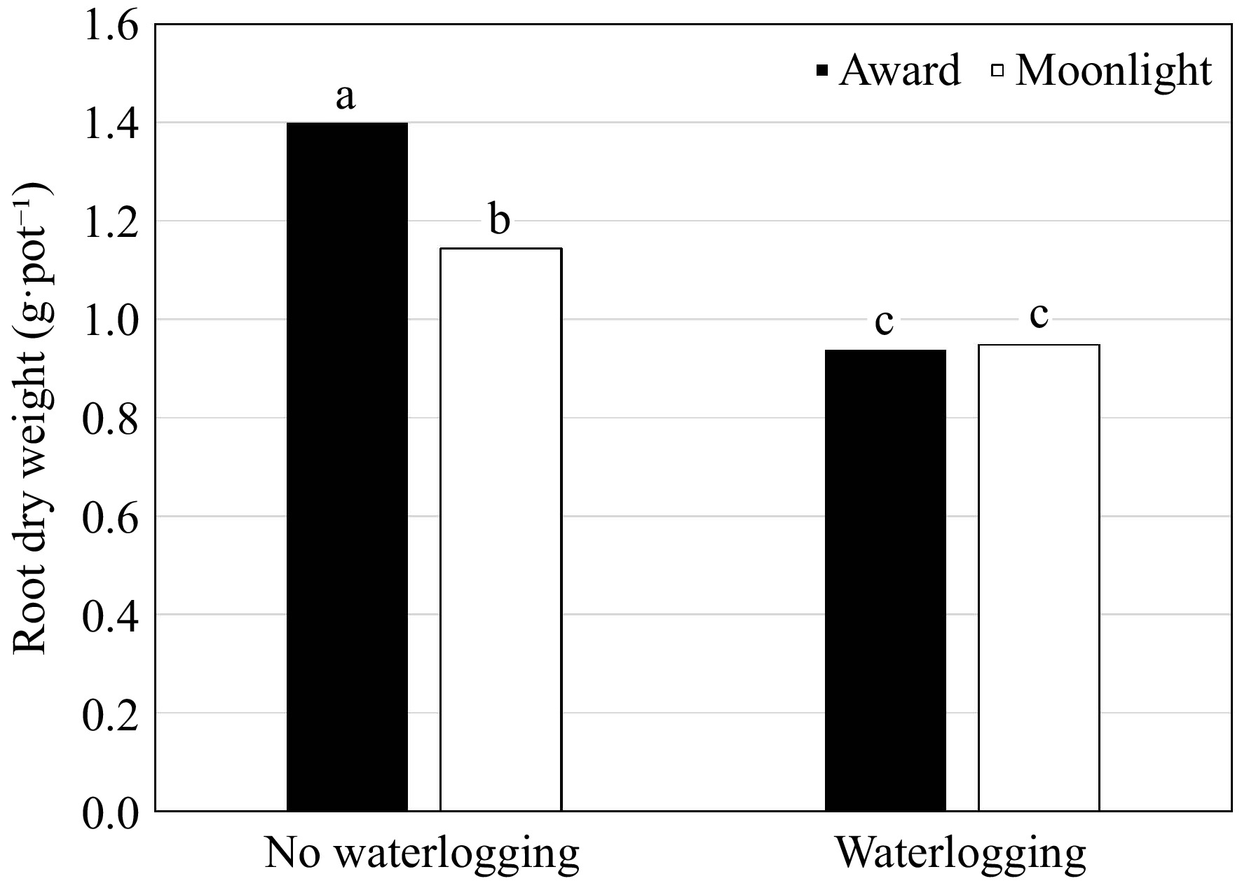 (g·pot−1)Root to shoot ratio (%) Root length (cm) Specific root length (cm·g−1) Waterlogging (W) Non-waterlogged 2.41ay 1.28a 52.8a 22.0a 19.8b Waterlogged 2.16b 0.94b 46.2b 20.9a 26.2a p-value * * * nsx * Cultivar (C) Award 2.53a 1.17a 46.8b 21.4a 21.9a Moonlight 2.04b 1.05b 52.1a 21.5a 24.1a p-value * * * ns ns Primingz (P) ABA 2.33a 1.28a 54.8a 22.8a 22.4a GB 2.27a 1.12a 50.9a 22.3a 24.9a DD 2.57a 1.09a 44.6a 22.8a 24.3a GA 2.27a 1.08a 49.2a 21.6a 24.4a KNO3 2.46a 1.15a 49.0a 22.6a 20.9a NP 1.86a 0.90a 48.8a 19.8a 23.7a PEG 2.31a 1.15a 49.6a 20.5a 22.0a SS 2.21a 1.08a 49.0a 19.4a 21.5a p-value ns ns ns ns ns C × P ns ns ns ns ns C × W ns * * ns ns P × W ns ns ns ns ns C × P × W ns ns ns ns ns zThe priming treatments are: abscisic acid at 50 ppm (ABA), glycinebetaine at 100 mM (GB), no priming (NP), deionized and distilled water (DD), gibberellic acid at 100 ppm (GA), KNO3 at 500 ppm (KNO3), polyethylene glycol-6,000 at 20% (PEG), and a Na2SO4 + MgSO4 (1:1, w:w) at 3 dS·m−1 (SS). yMeans in a column followed by the same letter are not significantly different according to Fisher's protected least significant difference test (p ≤ 0.05). xns and * mean no significant differences and significant differences at p ≤ 0.05, respectively. An interaction of waterlogging × cultivar was detected in RDW and RDW/SDW (Table 4). Waterlogging inhibited RDW in both cultivars with a reduction of 49.2% and 20.8% for 'Award' and 'Moonlight', respectively (Fig. 3). Although the RDW of 'Award' was higher than that of 'Moonlight' under non-waterlogging conditions, the differences in RDW between the two cultivars diminished under waterlogging stress. A reversed trend was observed in the RDW/SDW ratio (Fig. 4). No differences were observed in the priming treatments in RDW and RDW/SDW (Table 4).