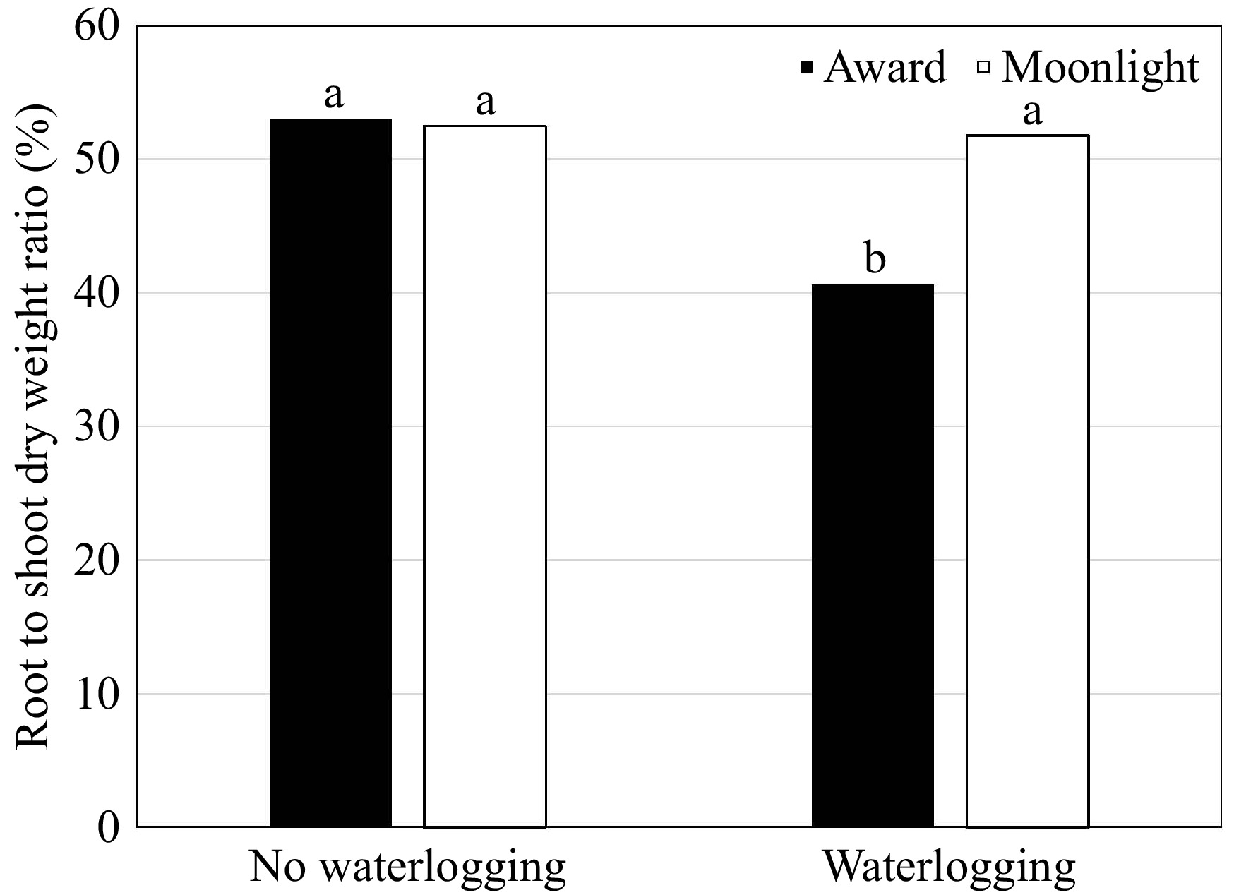 Root to shoot dry weight ratio (%) of Kentucky bluegrass seedlings as affected by the cultivar × waterlogging interaction when data were pooled across priming treatments. Means followed by the same letter are not significantly different according to Fisher's protected least significant difference test (p ≤ 0.05).