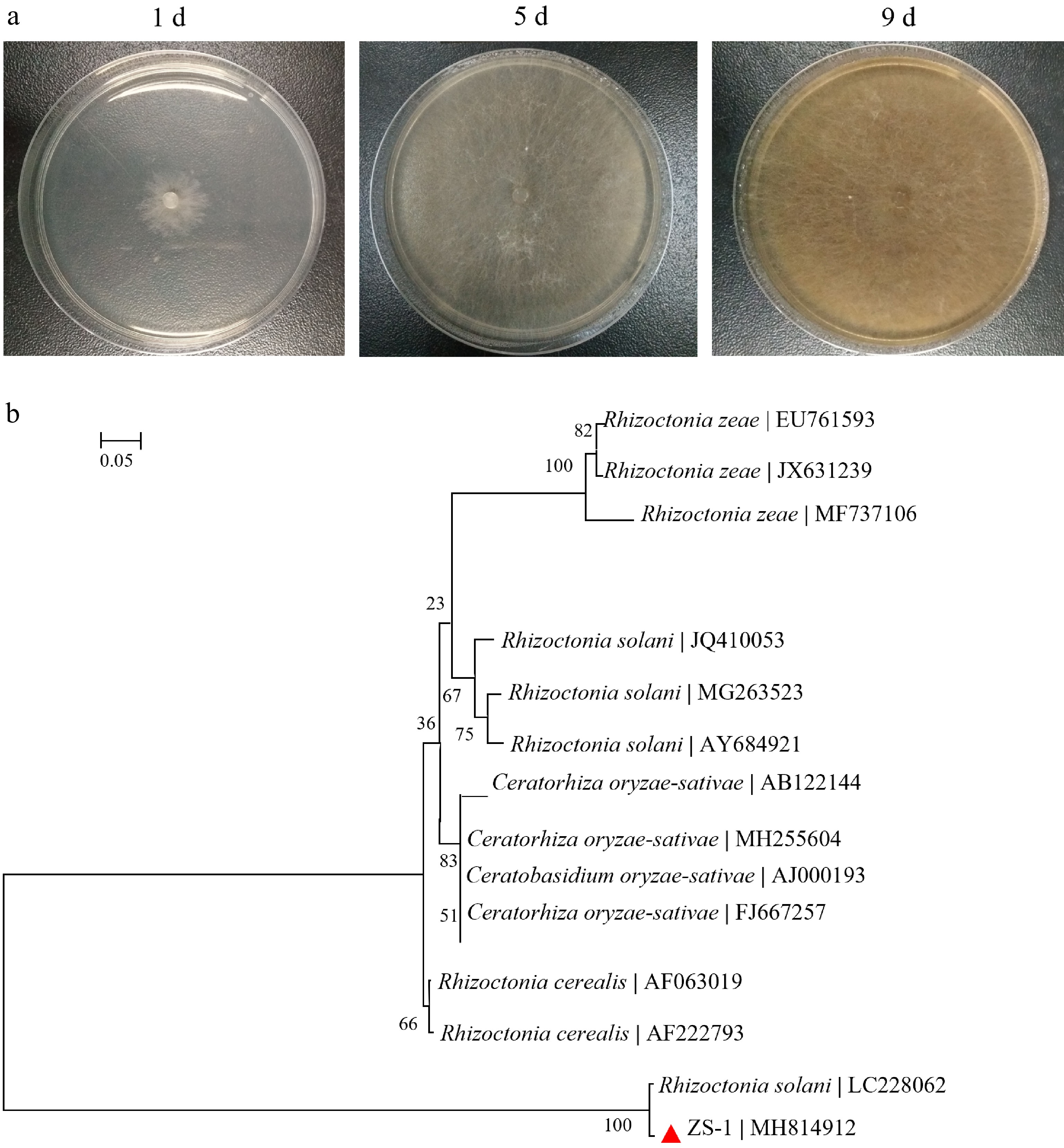 • A pathogenic fungal strain, designated as ZS-1, was successfully isolated from a diseased zoysiagrass sample. In the initial stages of growth on the PDA medium, the ZS-1 strain exhibited colorless hyphae that extended outward. By the 5th day of cultivation, the hyphae changed in color from colorless to light yellow, and a small amount of aerial mycelium emerged on the colony's surface. On the 9th day of growth, the surface aerial mycelium disappeared, and the hyphae began to aggregate. Over time, the hyphae gradually transitioned from light yellow to brown (Fig. 1a). Following PCR amplification and sequencing, a 783 bp fragment was obtained from strain ZS-1. The sequence was deposited in the GenBank database and assigned the accession number MH814912. BLAST sequence analysis of the ITS region using primers ITS1/ITS4 revealed that strain ZS-1 exhibited over 99% homology with multiple strains of Rhizoctonia solani. Notably, strain ZS-1 clustered together with the strain bearing accession number LC228062 of R. solani in the same clade, with a robust bootstrap confidence level of 100% (Fig. 1b). However, ZS-1 formed distinct branches separate from other Rhizoctonia species such as Ceratobasidium oryzae-sativae, Rhizoctonia zeae, and Rhizoctonia cerealis, as determined through sequence analysis and morphological observations. Consequently, the strain ZS-1, isolated from the infected zoysiagrass sample, was identified as Rhizoctonia solani.