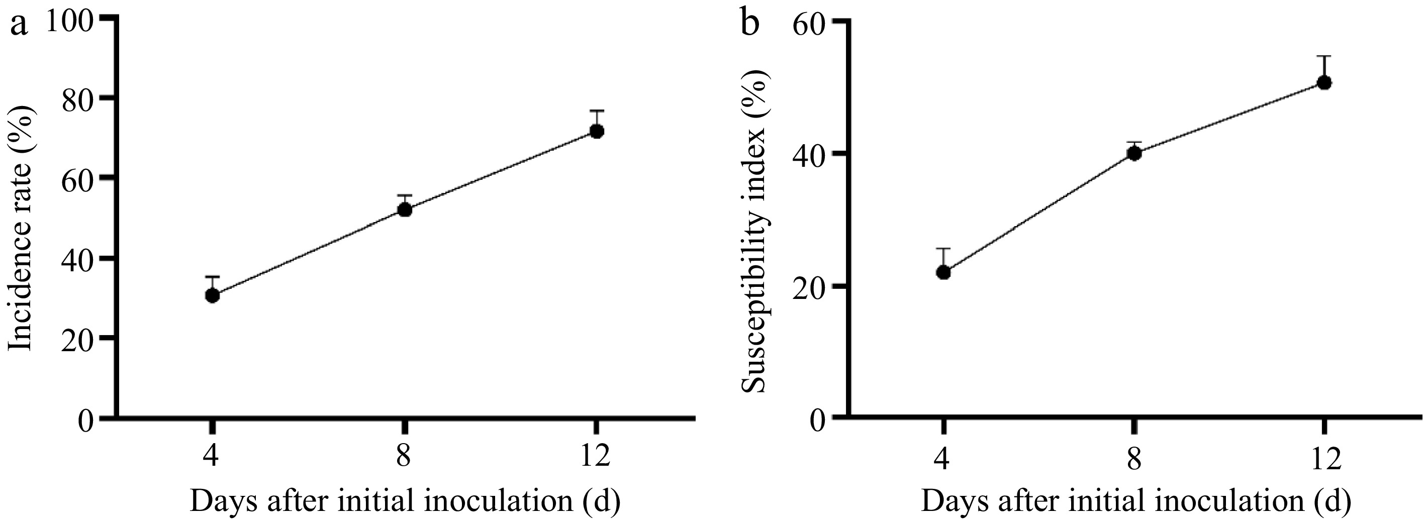 (a) The incidence rate, and (b) severity index after ZS-1 strain invasion.
