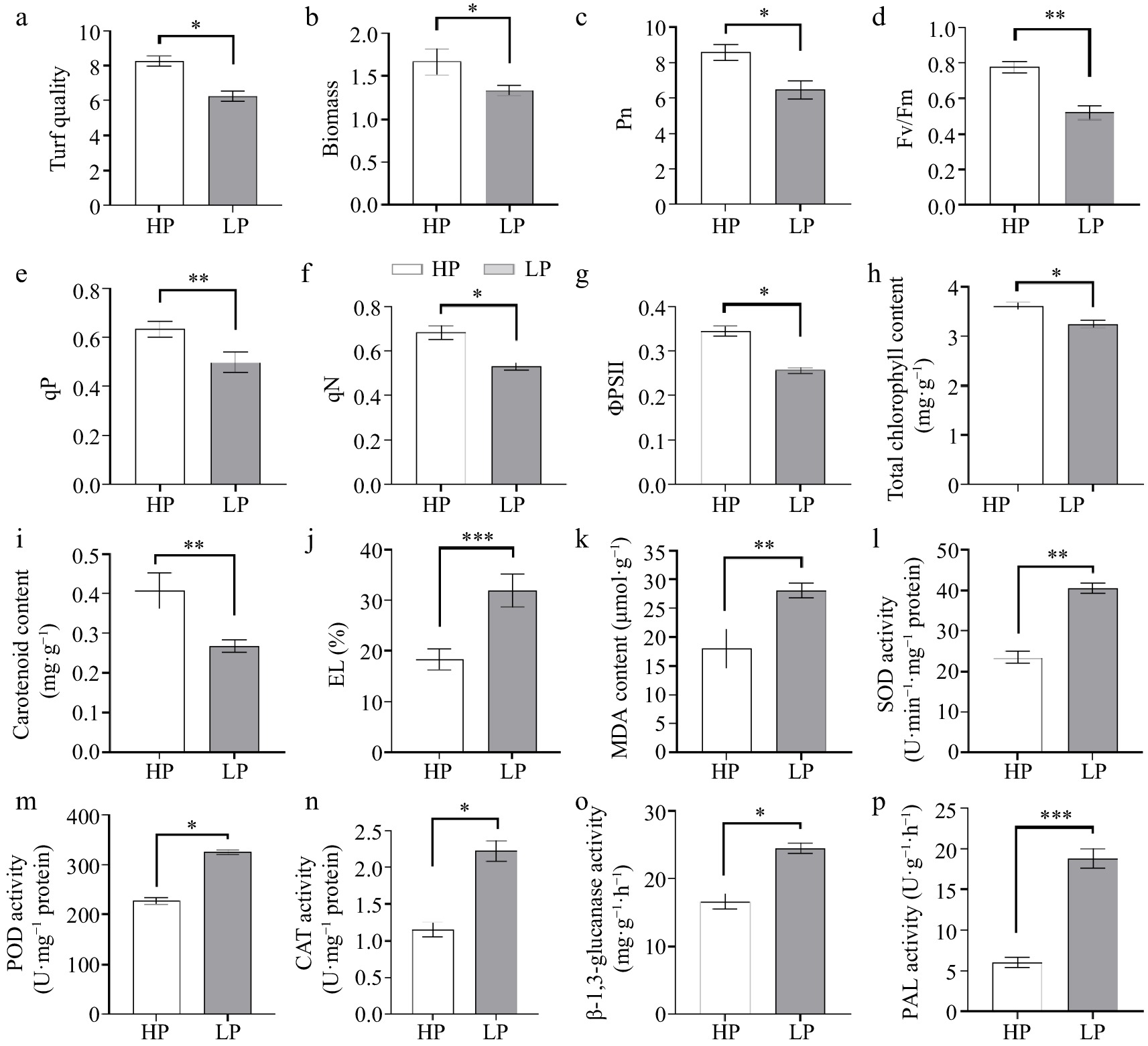 Physiological indicators including (a) turf quality, (b) biomass, (c) net photosynthetic rate (Pn), (d) maximum quantum yield of PSII (Fv/Fm), (e) photochemical quenching (qP), (f) non-photochemical quenching (qN), (g) the photosystem II Efficiency (ΦPSII), (h) chlorophyll content, and (i) carotenoid content, (j) EL, (k) MDA level, (l) SOD, (m) POD, (n) CAT, (o) β-1,3-glucanase, and (p) PAL activities. (n = 3; 'LP' represents zoysiagrass grown with ZS-1 strain invasion; 'HP' represents zoysiagrass grown without ZS-1 strain invasion. '*', '**', '***', indicate significant differences at p < 0.05, p < 0.01, and p < 0.001, respectively).