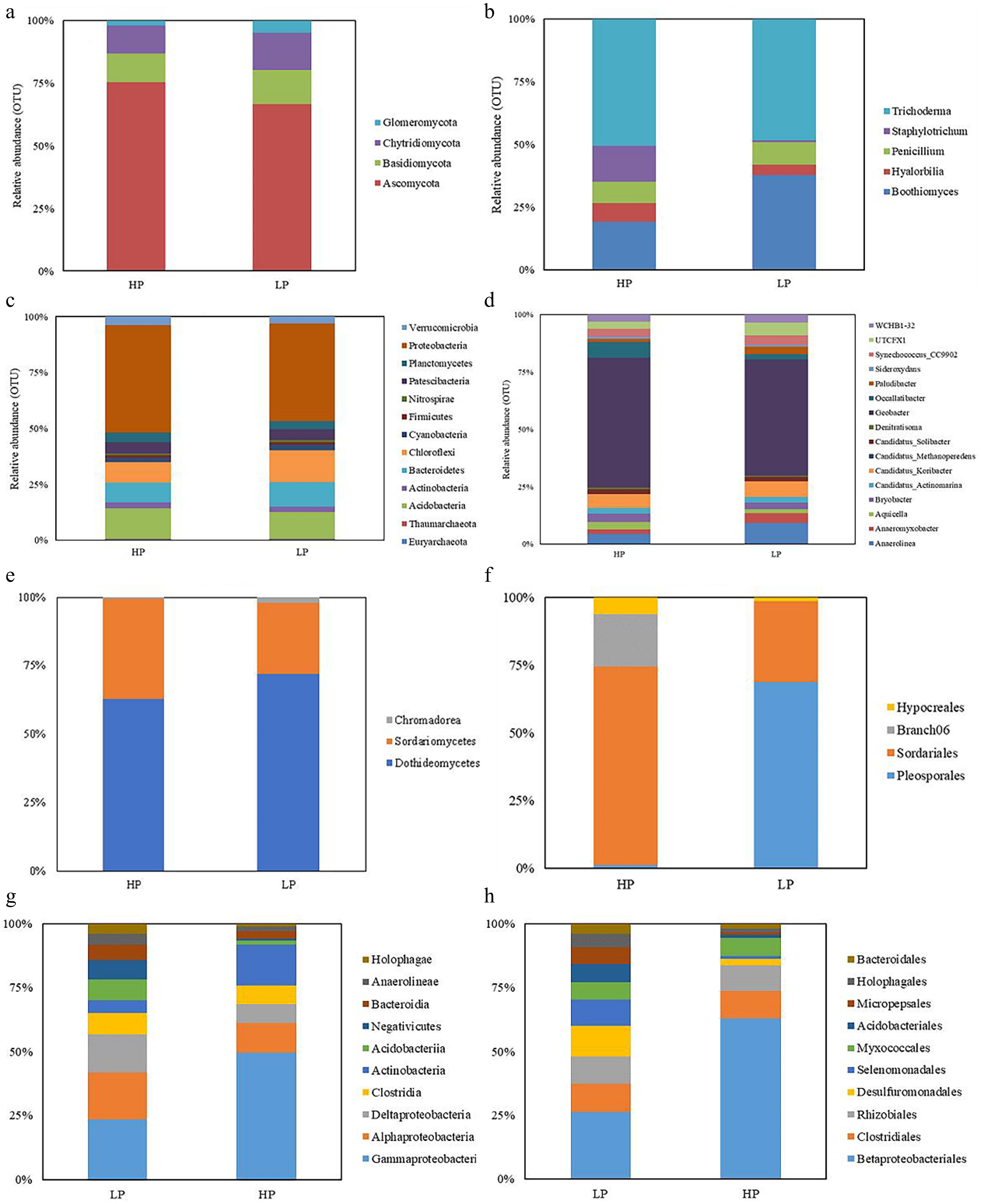 The relative abundance of rhizosphere soil fungal (at the (a) phylum, and (b) genus level), and bacteria (at the (c) phylum, and (d) genus level) community as well as root fungal (at the (e) class, and (f) order level), and bacteria (at the (g) class, and (h) order level) community under ZS-1 strain invasion conditions. (n = 3; 'LP' represents zoysiagrass grown with ZS-1 strain invasion; 'HP' represents zoysiagrass grown without ZS-1 strain invasion).