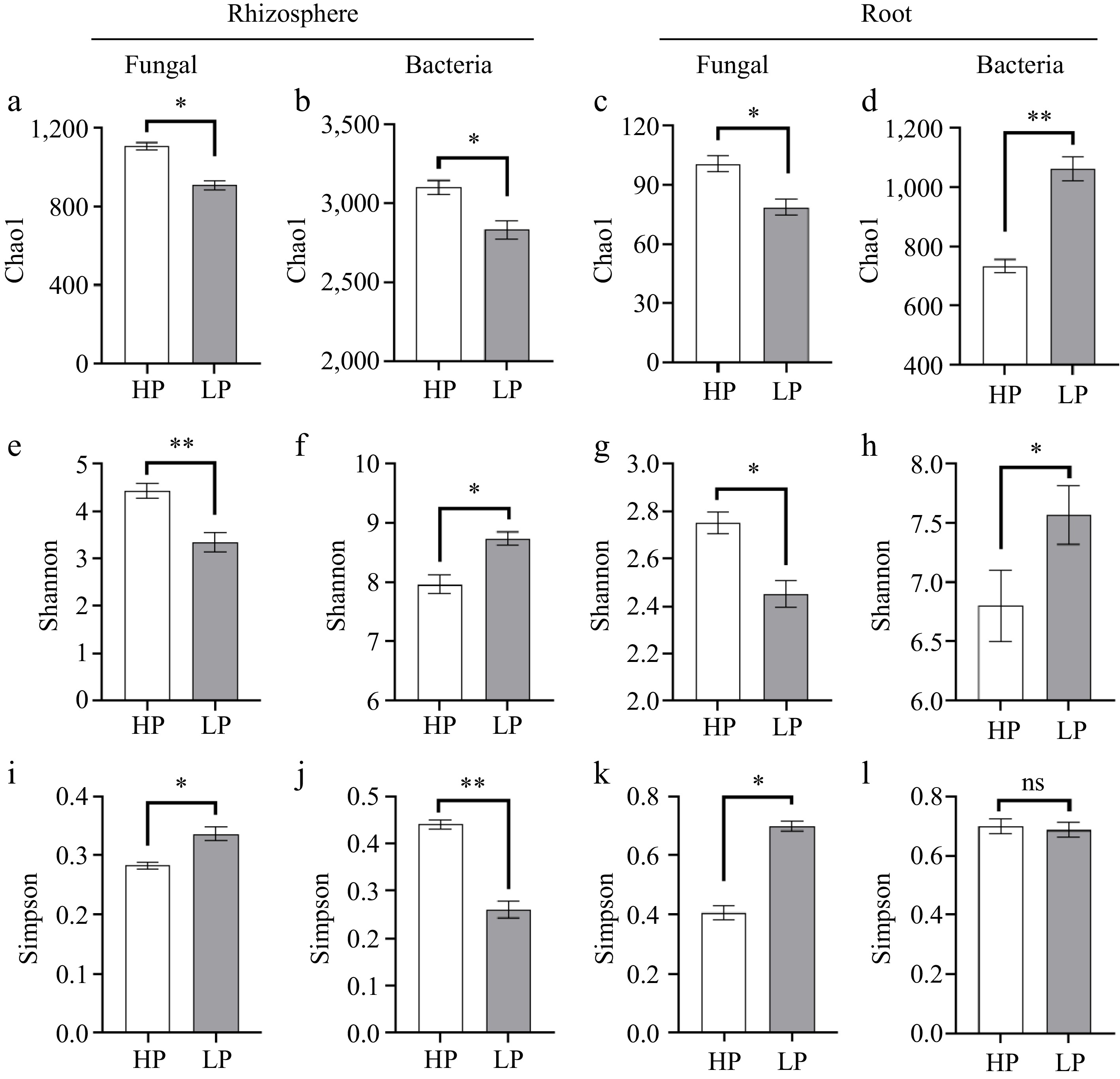 Alpha diversity. Fungal and bacterial diversity and richness in rhizosphere soil and root. (a) Chao1, (e) Shannon, and (i) Simpson index of fungi in rhizosphere soil; (b) Chao1, (f) Shannon, and (j) Simpson index of bacteria in rhizosphere soil; (c) Chao1, (g) Shannon, and (k) Simpson index of fungi in root; (d) Chao1, (h) Shannon, and (l) Simpson index of bacteria in root. Bars denote means ± SE. (n = 3; 'LP' represents zoysiagrass grown with ZS-1 strain invasion; 'HP' represents zoysiagrass grown without ZS-1 strain invasion. '*', '**', indicate significant differences at p < 0.05, and p < 0.01, respectively and 'ns' represents no significant difference).