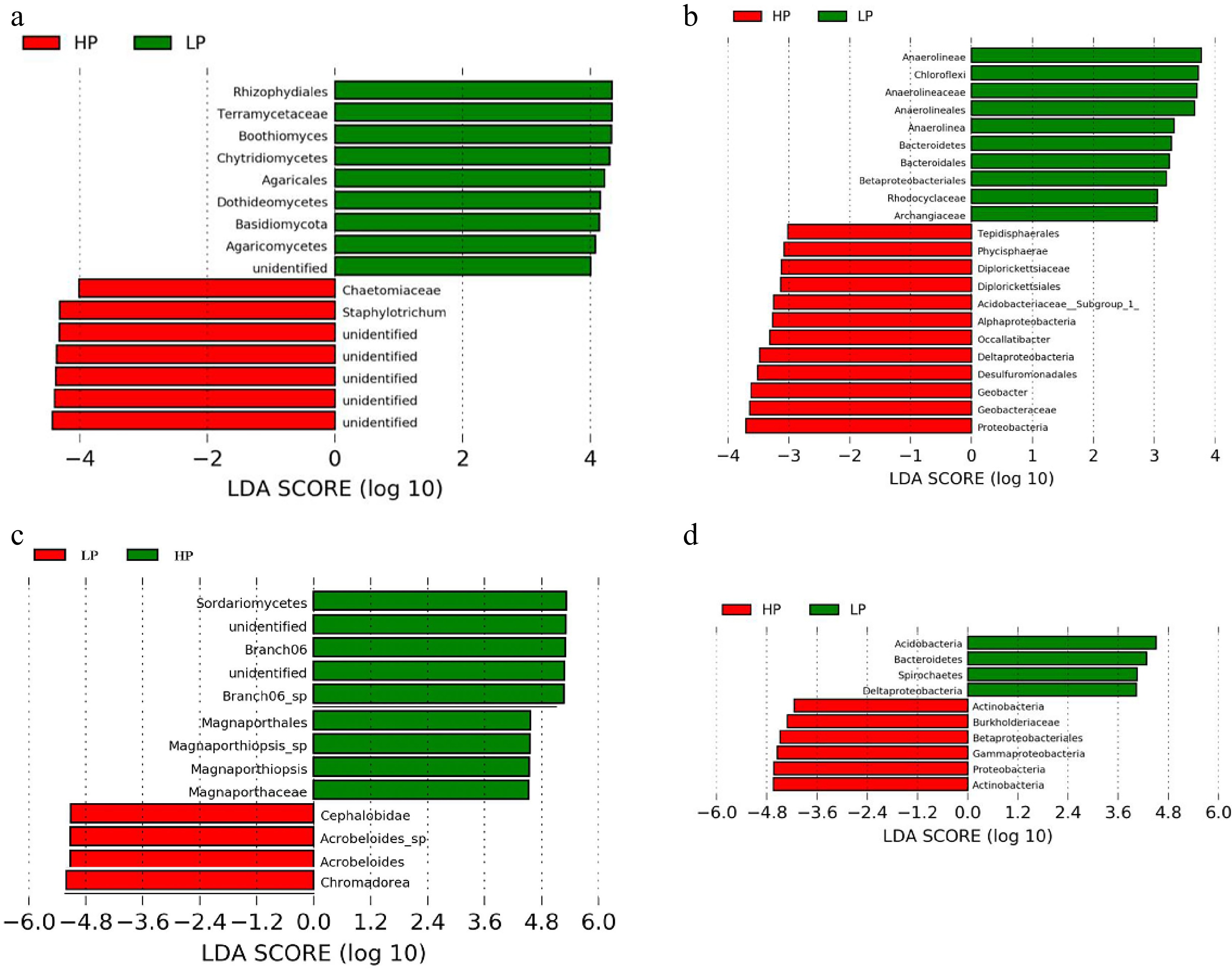 The taxonomic differences between treatments based on ZS-1 strain invasion in zoysiagrass. Linear discriminant analysis Effect Size (LEfSe) of fungi and bacteria in (a), (b) rhizosphere soil, and (c), (d) root. LEfSe map is a linear discriminant analysis based on the composition of sample taxonomy according to different grouping conditions. p < 0.05, LDA > 4 as the standard. ('LP' represents zoysiagrass grown with ZS-1 strain invasion; 'HP' represents zoysiagrass grown without ZS-1 strain invasion).