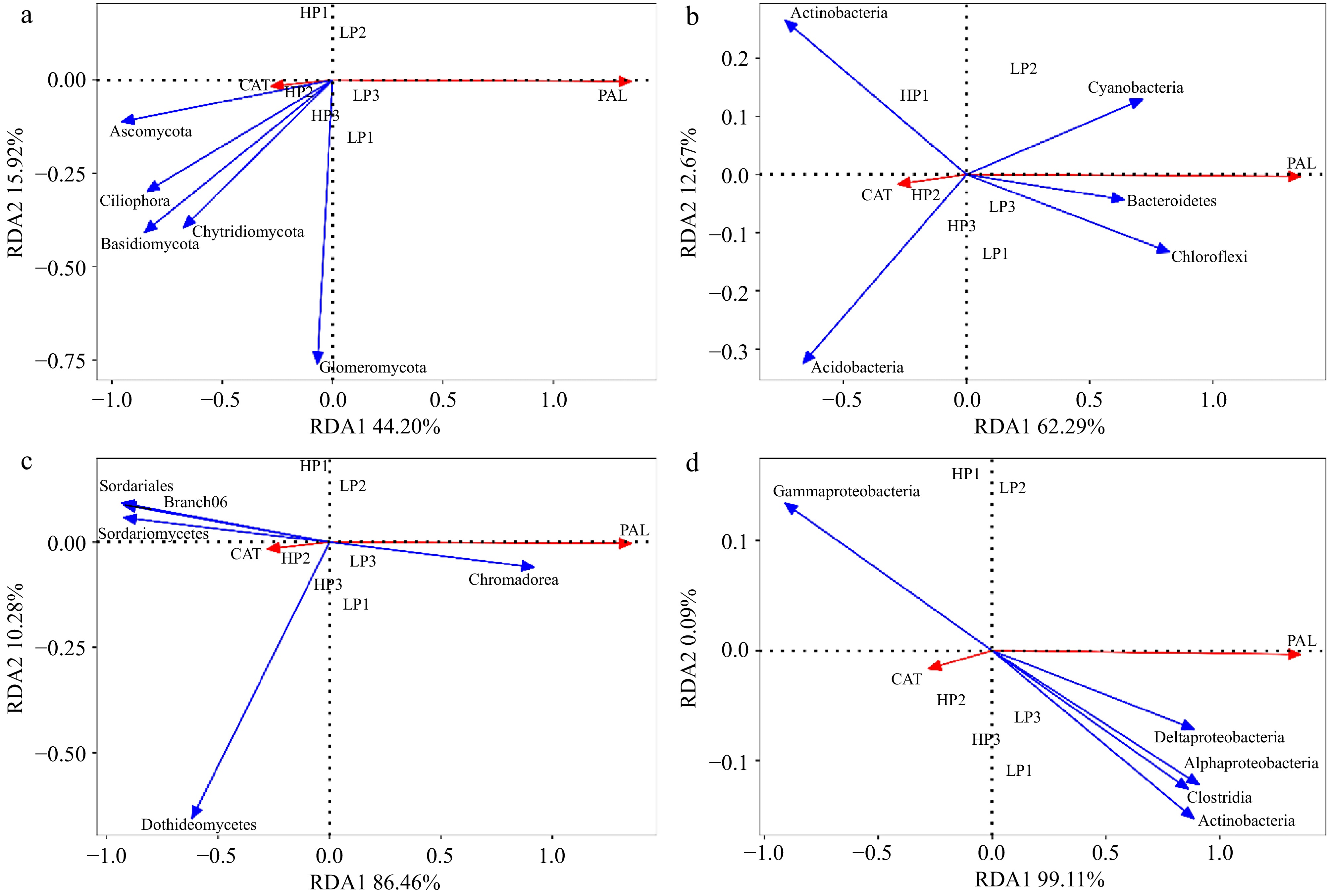 • The first and second RDA axes among rhizosphere soil fungal communities and plant indicators contributed 44.20% and 15.92% to the variance. The CAT activity was positively correlated with phyla Ascomycota, Anthophyta, Basidiomycota, Ciliophora, and Chytridiomycota. PAL activity was positively related to phyla Glomeromycota (Fig. 7a). The first and second RDA axes among rhizosphere soil bacterial communities and plant indicators contributed 62.29% and 12.67% to the variance. The CAT activity was positively correlated with phyla Actinobacteria and Acidobacteria. PAL activity was positively related to phyla Cyanobacteria, Bacteroidetes, and Chloroflexi (Fig. 7b).