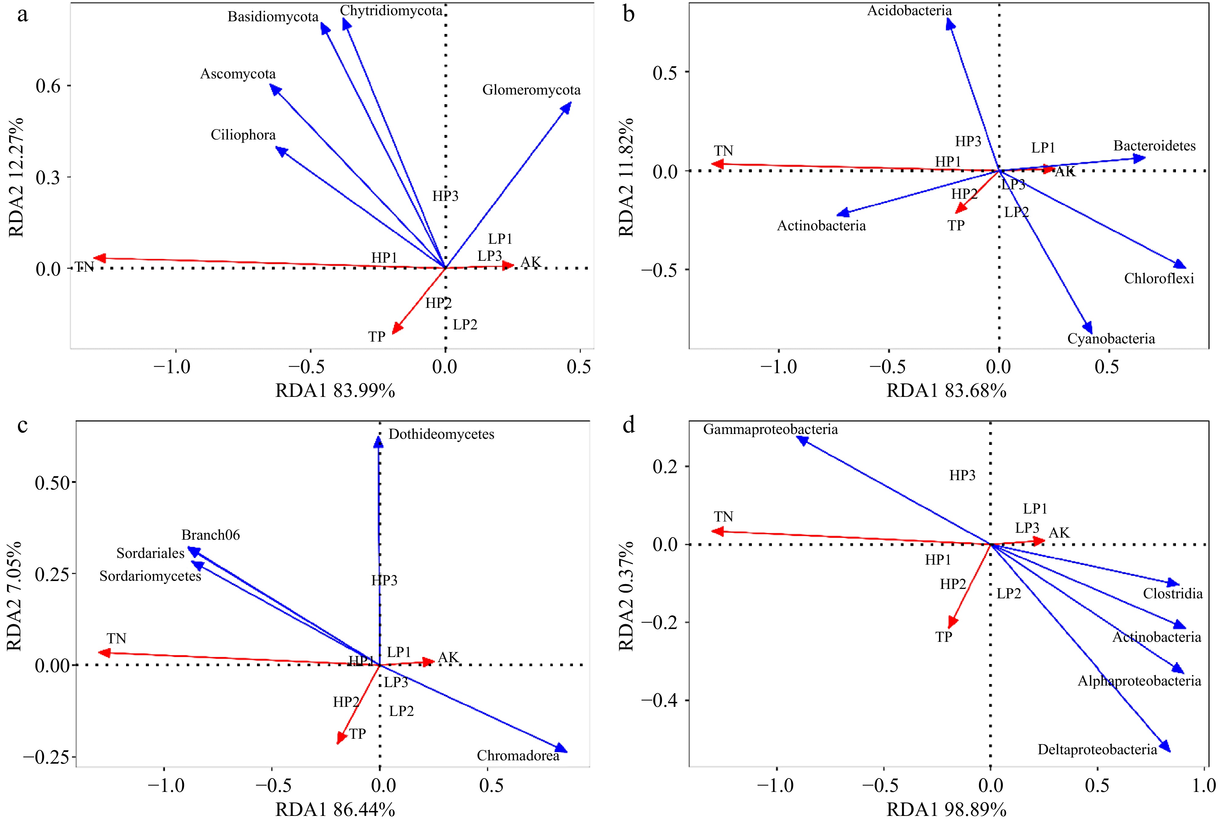 The first and second RDA axes among root soil fungal communities and soil properties contributed 86.44% and 7.05% to the variance. The AK was positively correlated with Chromadorea. TN and TP were positively related to Branch06, Sordariales, and Sordariomycetes (Fig. 8c). The first and second RDA axes among root soil bacterial communities and soil properties contributed 98.89% and 0.37% to the variance. The AK was positively correlated with Clostridia, Actinobacteria, Alphaproteobacteria, and Deltaproteobacteria. TN and TP were positively related to Gammaproteobacteria (Fig. 8d).