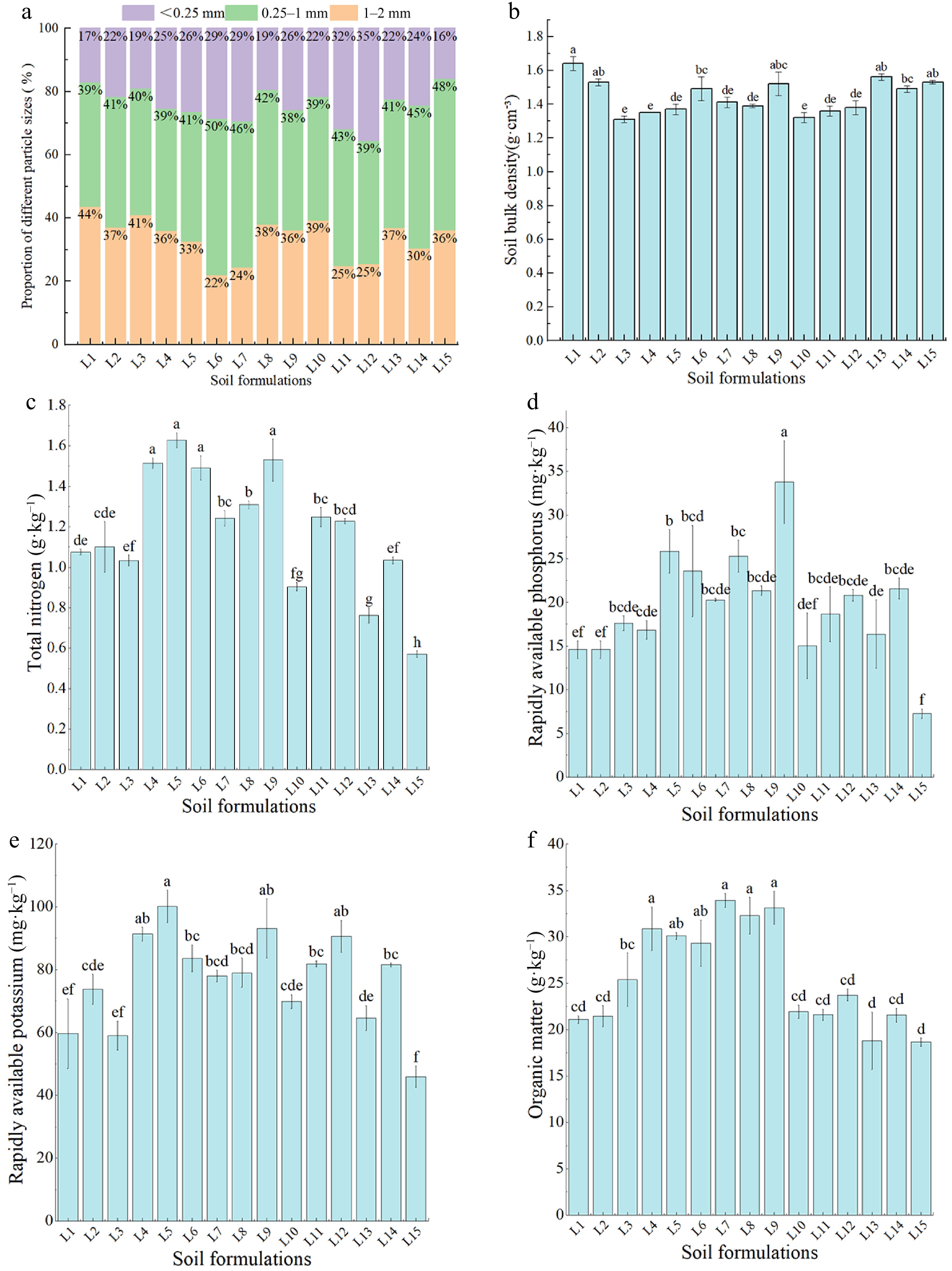 • According to the Chinese particle size classification standard (1987)[29], the particles of 1−3 mm are fine gravel, the particles of 0.25−1 mm are coarse sand, and the particles of < 0.25 mm are fine sand, silt, and clay. As shown in Fig. 2a, among the 15 soil formulations evaluated, the L1 treatment had the highest 1−2 mm particle size composition, and the L6 treatment had the lowest. The L6 treatment contained the highest proportion of 0.25−1 mm particles, and the L9 treatment had the lowest. The L12 treatment contained the most particles with a size of less than 0.25 mm, while the L15 treatment contained the least. The content of fine sand, silt, and clay in the soil increased as the proportion of waste slag soil was reduced from 100% to 0%. This increase was characterized by a trend of initial increase and subsequent decrease, suggesting that the mechanical composition of waste slag soil could be adjusted by the addition of different types of soil. This adjustment could potentially impact the water content, air permeability, and water permeability of the soil to a certain extent. The soil bulk density of the L6 and L9 treatments was lower than that of the L1 treatment (Fig. 2b) due to the former having the lowest proportion of 1−2 mm particle size and the latter having the lowest proportion of 0.25−1 mm particle size.