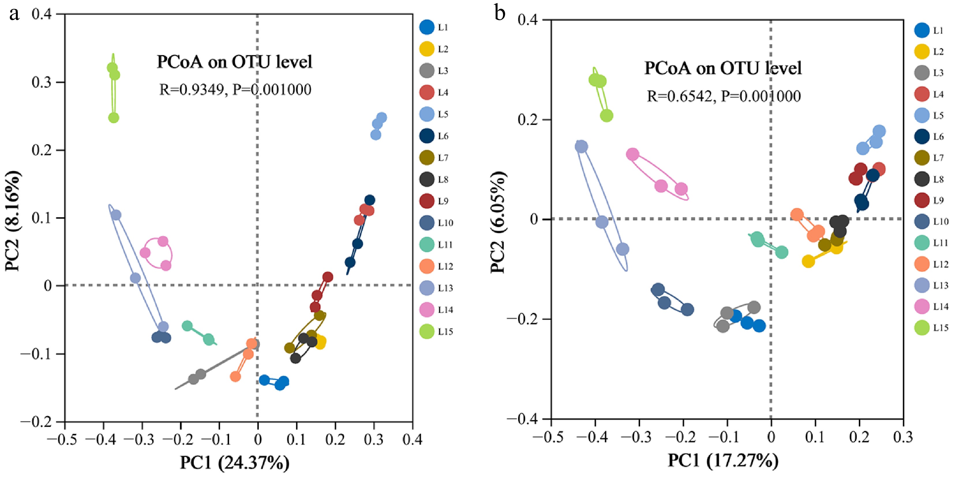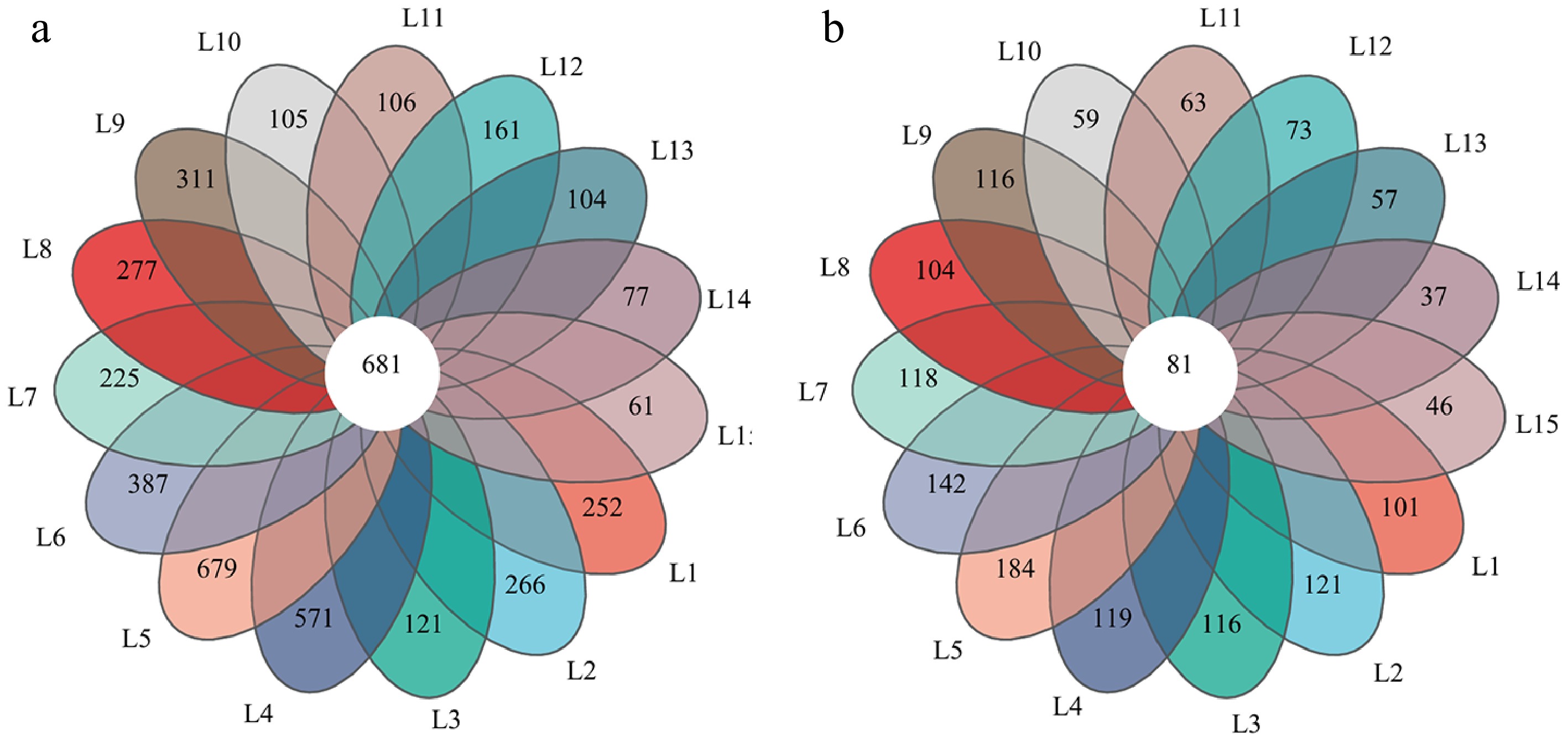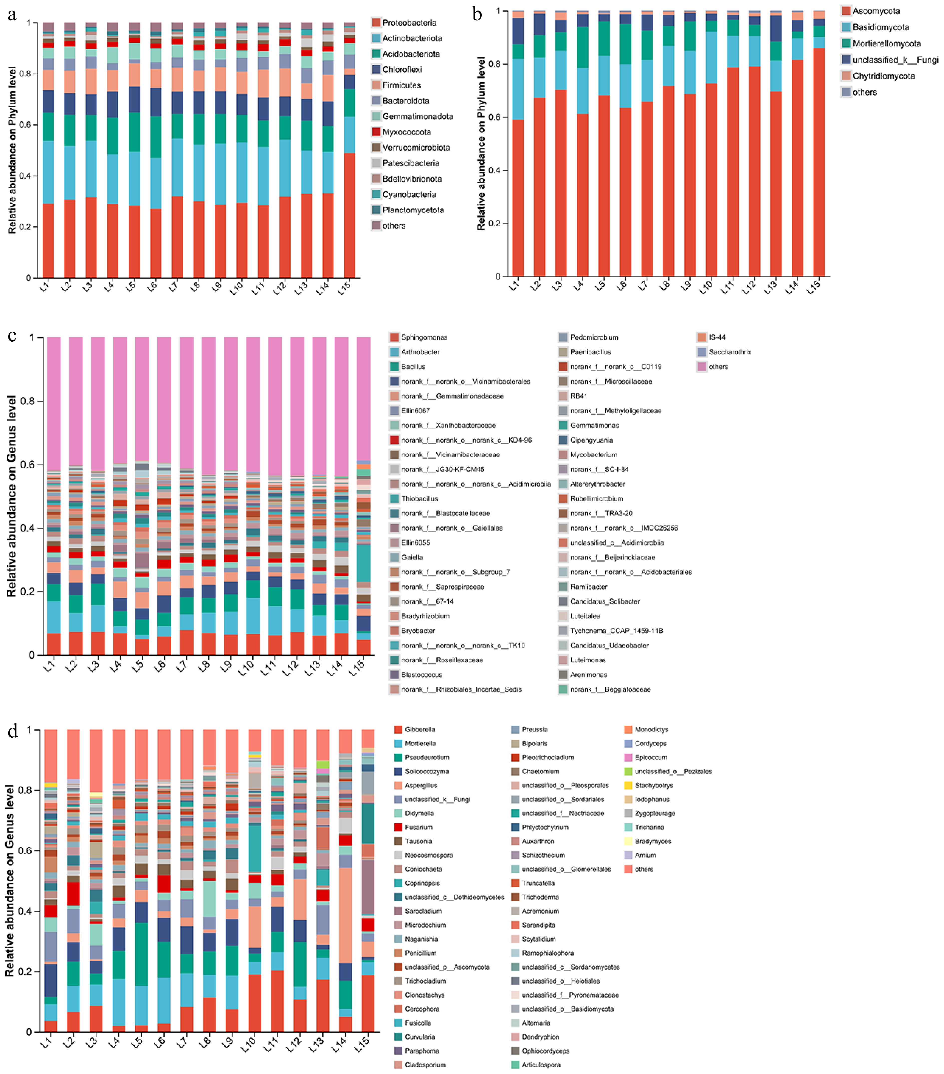 • The bacterial soil microbial community analysis revealed 2,923 OTUs, which were assigned to 36 phyla, 95 classes, 223 orders, 274 families, 647 genera, and 1,311 species. Among these, 681 OTUs were shared across all 15 treatments (Fig. 3a). The bacterial OTUs varied greatly across the treatments, with the L5 treatment containing the highest number of specific bacteria, followed by the L4 treatment, whereas the L15 treatment exhibited the lowest count (Fig. 3a). The fungal soil microbial community analysis revealed 4,004 OTUs, which were assigned to 16 phyla, 64 classes, 142 orders, 312 families, 695 genera, and 1,191 species; among these, 81 OTUs were shared across all 15 treatments (Fig. 3b). Fungal OTUs varied greatly across the treatments, with the L5 treatment containing the highest number of specific fungi, followed by the L6 treatment, with the least observed in L14.