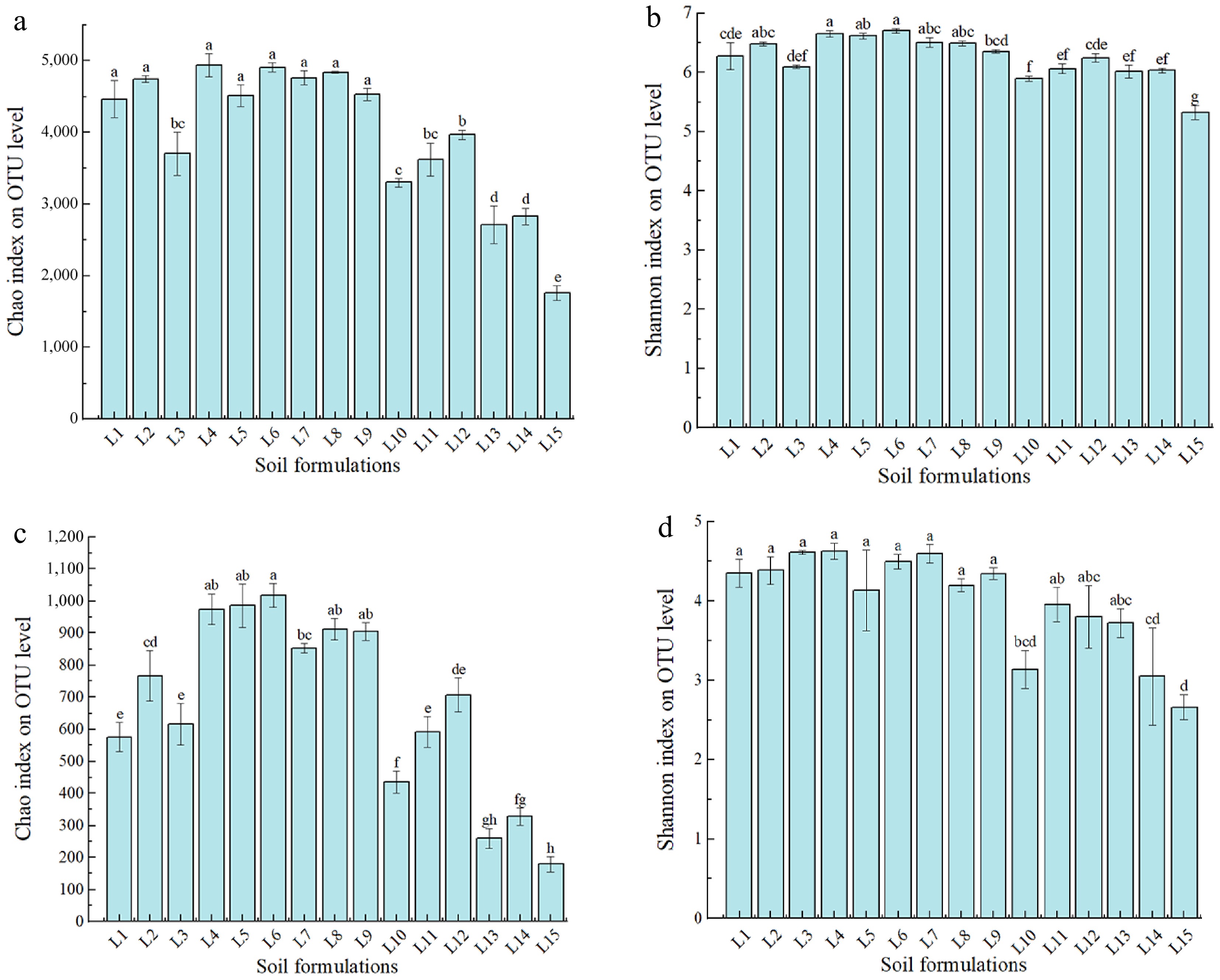 • The Chao1 indices of bacteria (Fig. 5a) and fungi (Fig. 5c) were higher in the treatment groups without added wastes and in the treatment groups with 25%, 50%, and 75% of waste slag added, respectively, than in the treatment group with only waste slag. The L4 and L6 treatments exhibited the highest Chao1 index, suggesting that the soil bacteria and fungi species were most abundant in these respective treatments. As evidenced by the Shannon index (Fig. 5b, d), the soil microbial diversity was improved after adding other types of soil.