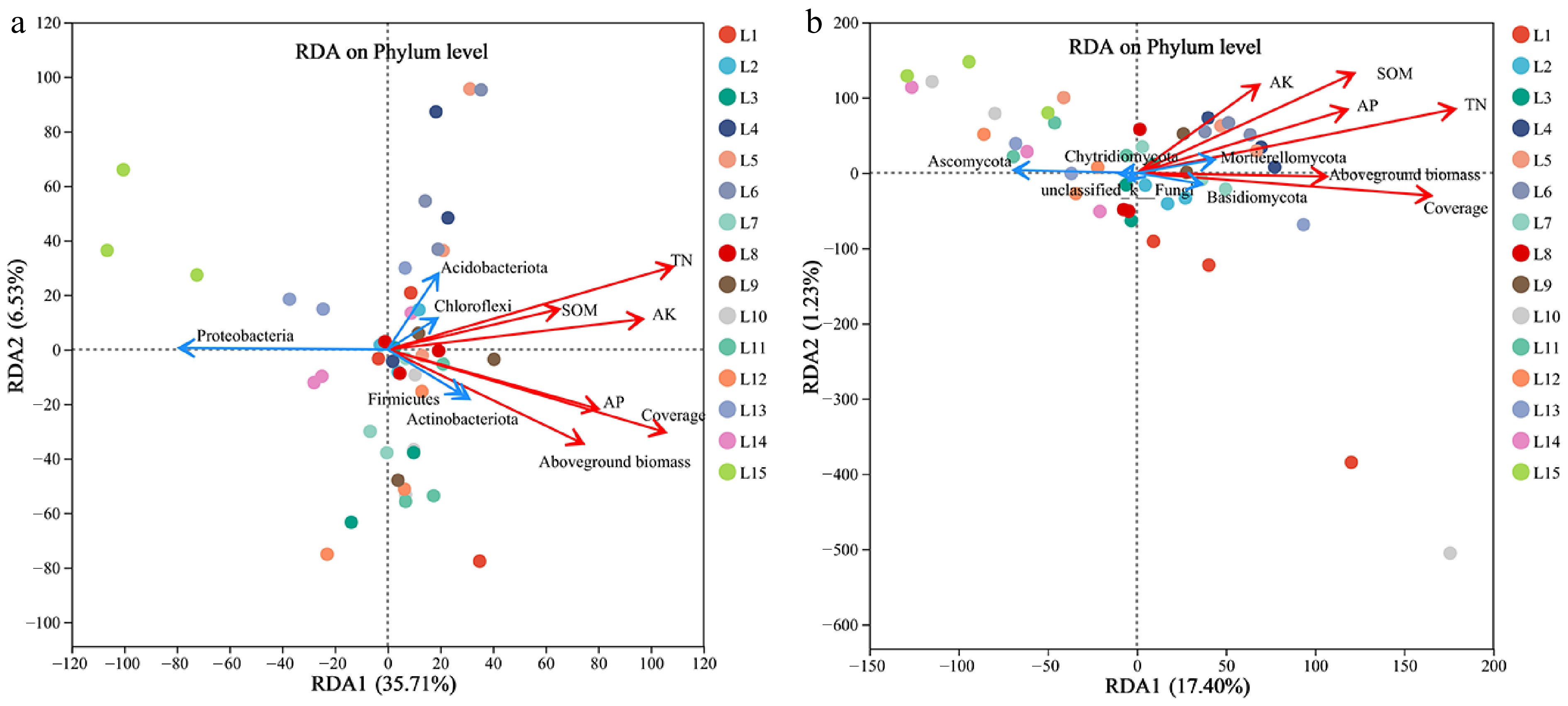• The first and second axes explained 35.71% and 6.53% of the variation in soil bacterial community structure, respectively (Fig. 7a). There was an acute angle between TN, AP, AK, and SOM, and an acute angle between coverage and aboveground biomass. Chloroflexi, Firmicutes, and Actinobacteriota were positively correlated with soil nutrient and plant growth indices, while Acidobacteriota was positively correlated with soil nutrient index and coverage, and Proteobacteria was negatively correlated with soil nutrient and plant growth indices.