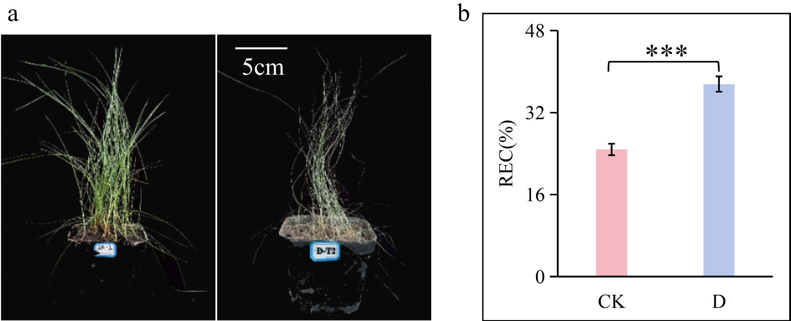 (a) Morphological changes in F. rubra under control (CK) and drought stress (D). (b) Relative electrical conductivity (REC). Data are presented as mean ± standard deviation (SD). Statistical significance between groups was determined by analysis of variance (ANOVA). *** p < 0.001.