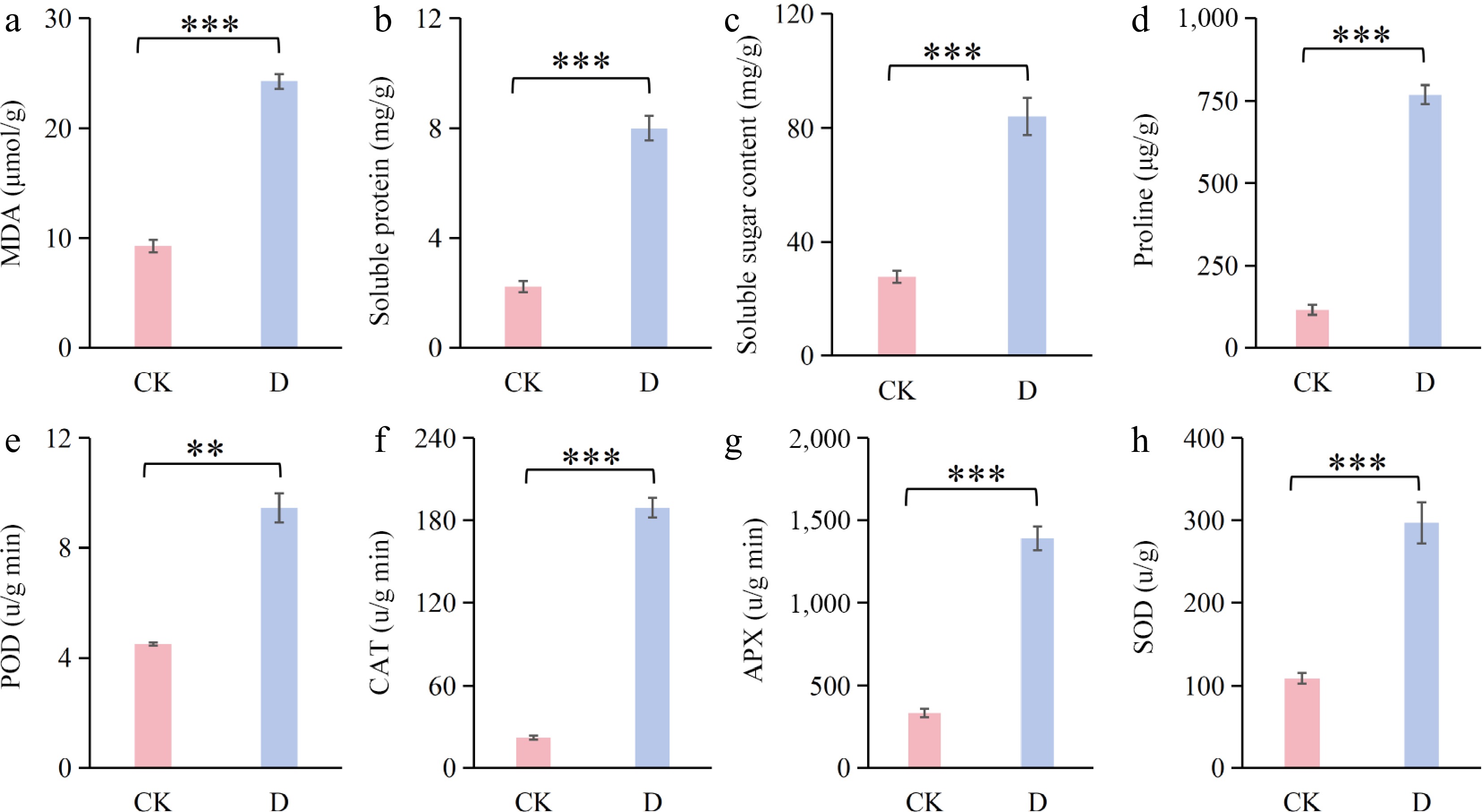 Osmoregulatory and antioxidant changes in F. rubra under drought stress (D) compared with the control (CK): (a) Malondialdehyde (MDA); (b) soluble protein; (c) peroxidase (POD); (d) catalase (CAT); (e) soluble sugar content; (f) proline; (g) ascorbate peroxidase (APX); and (h) superoxide dismutase (SOD). All data are presented as the mean ± SD. Differences between the two groups were analyzed by ANOVA. ** 0.001 < p < 0.01; *** p < 0.001.