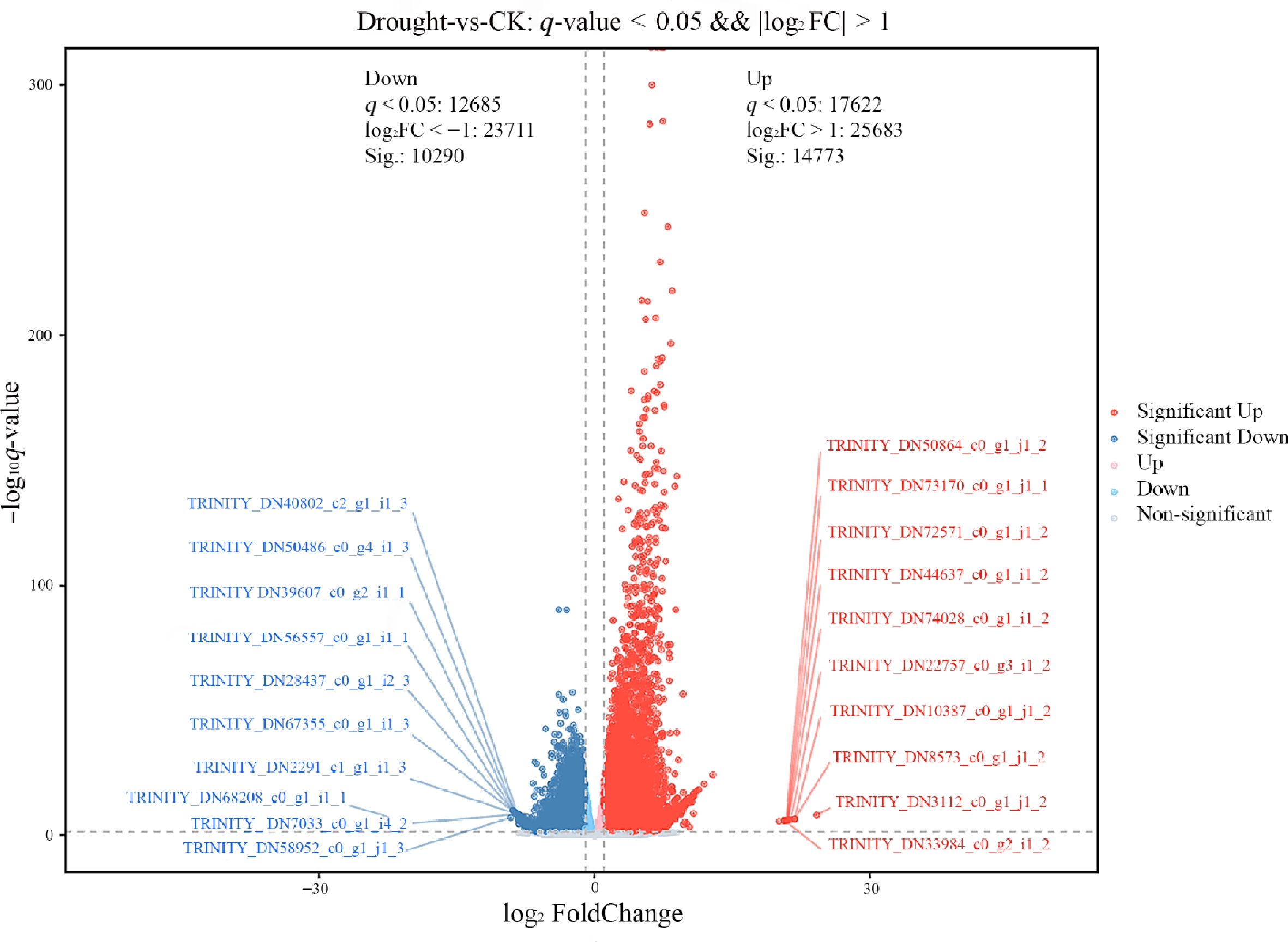 • Differential expression analysis under drought stress identified 25,063 DEGs in F. rubra, comprising 14,773 upregulated genes and 10,290 downregulated genes (Fig. 4).