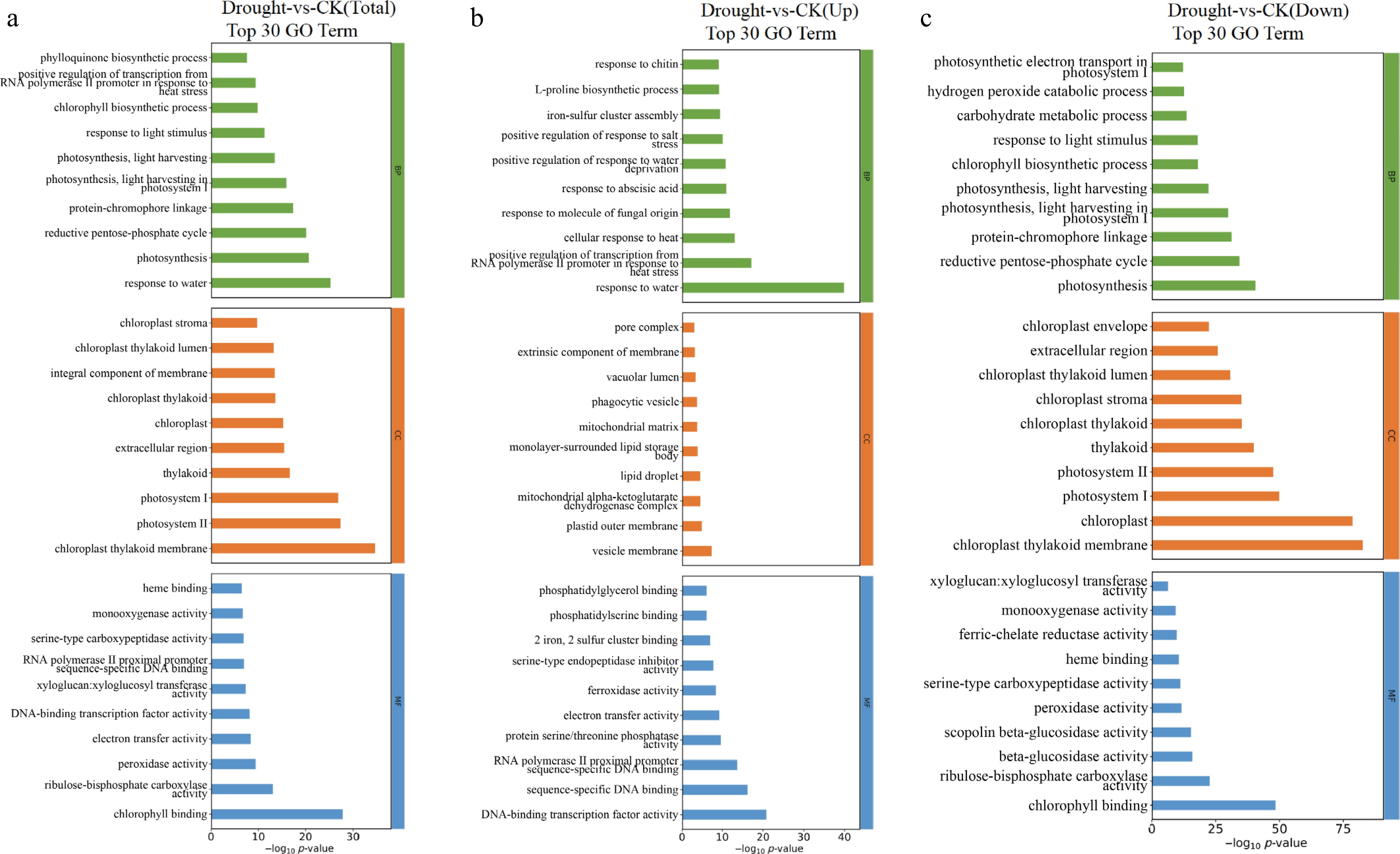 Top 30 bar charts of GO functional enrichment analysis of DEGs in F. rubra under drought stress compared with the control: (a) Total, (b) upregulated, and (c) downregulated. Screened GO terms with PopHits ≥ 5 in the biological process (BP), cellular component (CC), and molecular function (MF) categories, sorted by –log10 p-value.