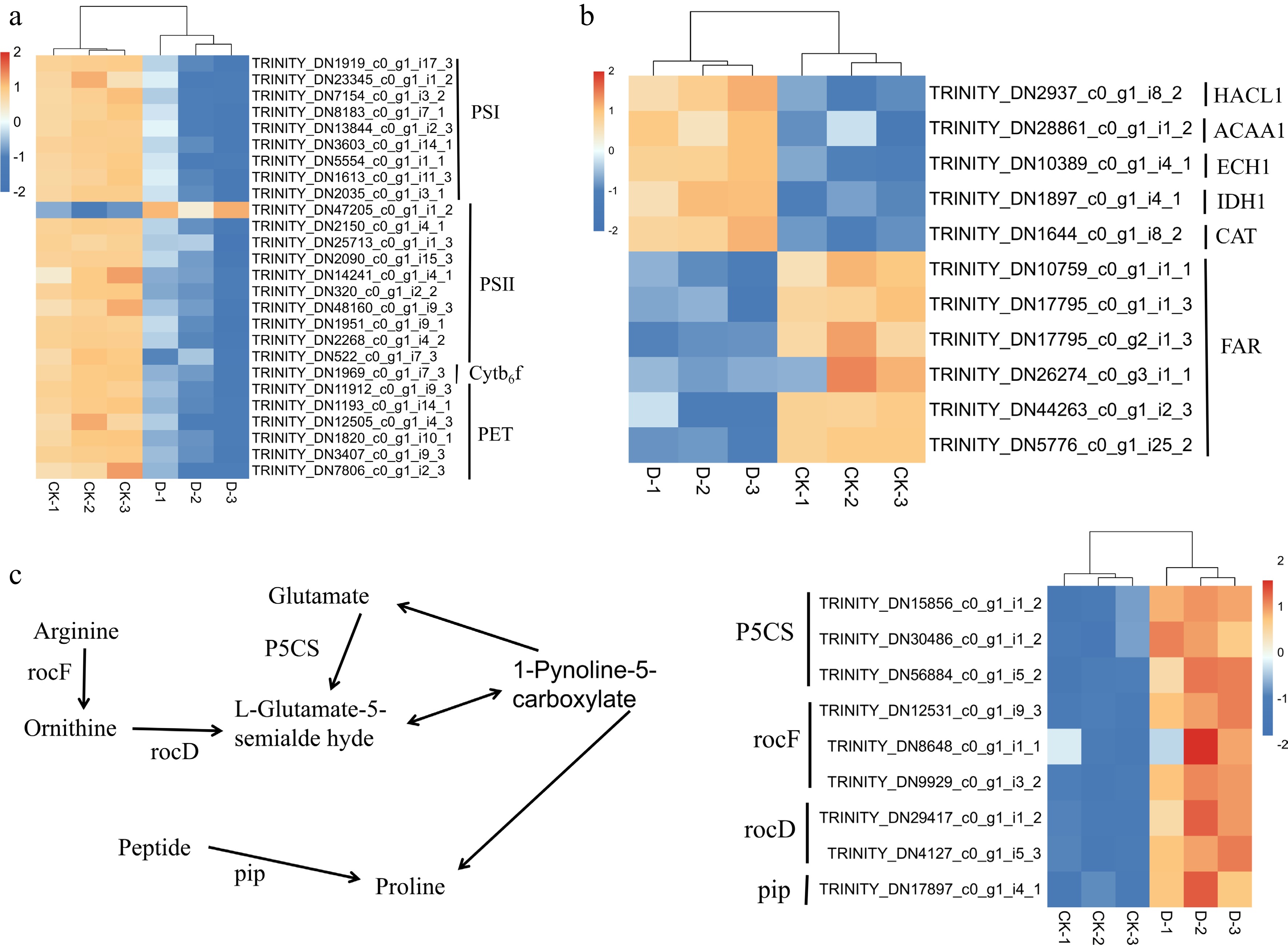 • Analysis of the key metabolic pathways revealed distinct expression patterns under drought stress (Fig. 8). In the photosynthesis pathway, the expression of most genes related to Photosystem I (PSI), PSII, Cytochrome b6f complex (Cytb6f) and Photosynthetic Electron Transport (PET) were downregulated (blue) under drought stress (Fig. 8a). Conversely, in the peroxisome pathway, the expression of genes such as HACL1, ACAA1, ECH1, IDH1, and CAT were found to be significantly upregulated (red) under drought stress, whereas FAR-related genes were predominantly downregulated (blue) (Fig. 8b). In the proline biosynthesis pathway, the expression of key genes, such as P5CS, rocF, rocD and pip, were significantly upregulated (red) under drought stress (Fig. 8c), indicating accelerated conversion of glutamate to L-glutamate-5-semialdehyde and enhanced metabolic pathways from ornithine and glutamate to proline.