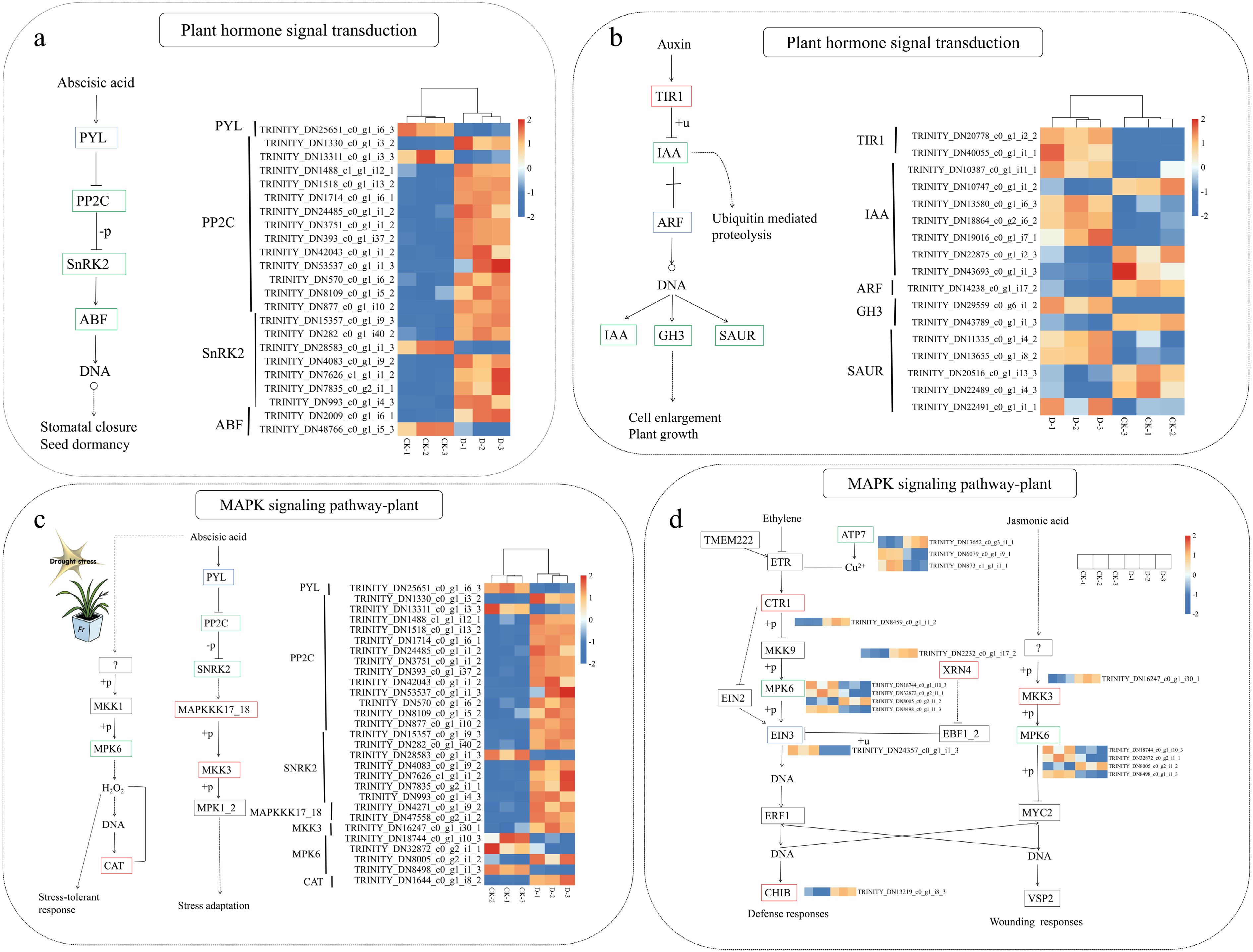 Heatmap of DEGs related to (a, b) plant hormone signal transduction and (c, d) the MAPK signaling pathway in F. rubra under control (CK) and drought stress (D) conditions. Red boxes indicate upregulated genes, blue boxes indicate downregulated genes, and green boxes indicate genes with both upregulation and downregulation. Rows represent different genes, and columns represent different treatments (CK-1, CK-2, CK-3, D-1, D-2, D-3). Colors show relative gene expression levels (red for upregulation, blue for downregulation). The heatmap was created using gene_id and FPKM values (Supplementary Table S2).